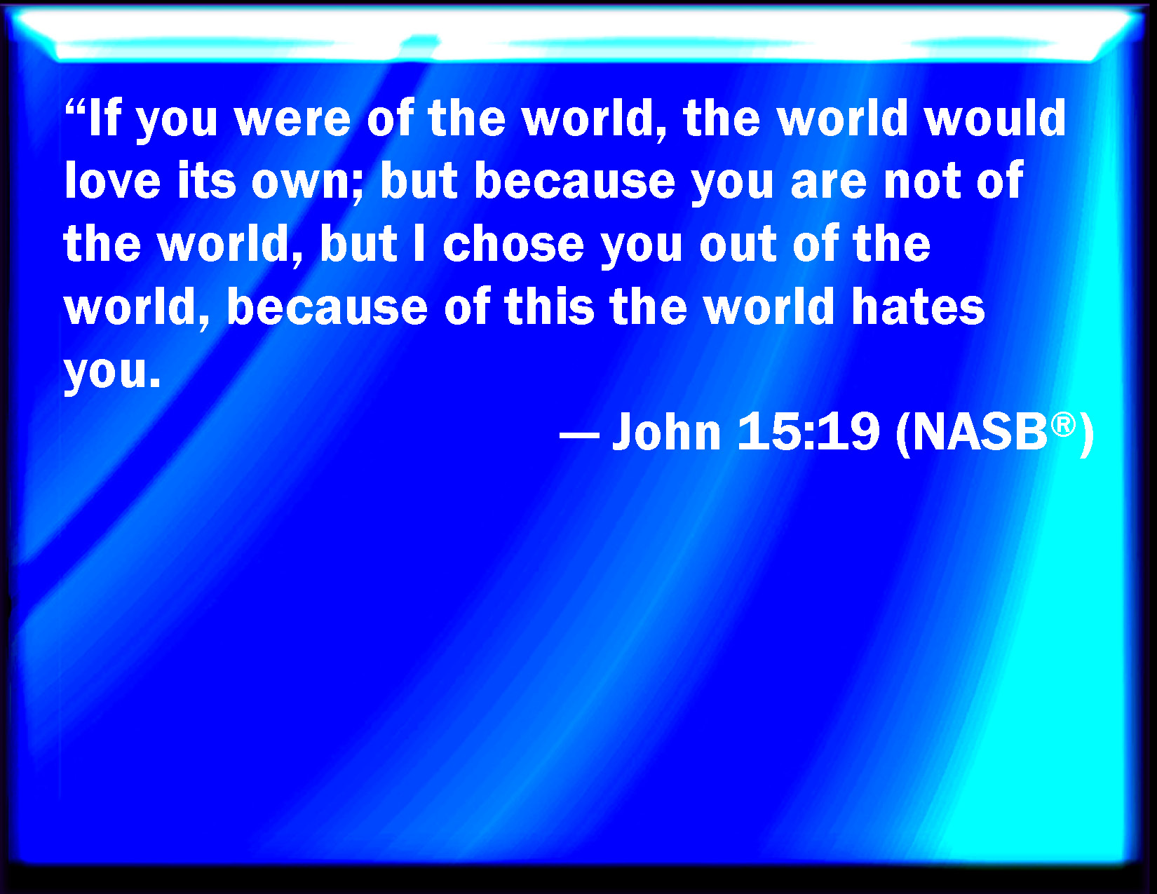 Bible Verse Slide John 15:19 If you were of the world, the world would love his own: but because you are not of the world, but I have chosen you out of the world, therefore the world hates you. KJV: If ye were of the world, the world would love his own: but because ye are not of the world, but I have chosen you out of the world, therefore the world hateth you. DRB: If you had been of the world, the world would love its own: but because you are not of the world, but I have chosen you out of the world, therefore the world hateth you. DBT: If ye were of the world, the world would love its own; but because ye are not of the world, but I have chosen you out of the world, on account of this the world hates you. ERV: If ye were of the world, the world would love its own: but because ye are not of the world, but I chose you out of the world, therefore the world hateth you. WBT: If ye were of the world, the world would love its own: but because ye are not of the world, but I have chosen you out of the world, therefore the world hateth you. WEB: If you were of the world, the world would love its own. But because you are not of the world, since I chose you out of the world, therefore the world hates you. YLT: if of the world ye were, the world its own would have been loving, and because of the world ye are not — but I chose out of the world — because of this the world hateth you.Links John 15:19 NIV • John 15:19 NLT • John 15:19 ESV • John 15:19 NASB • John 15:19 KJV • John 15:19 Interlinear • John 15:19 Commentaries • John 15:19 Parallel Texts • John 15:19 Bible Apps • John 15:19 Parallel • Bible Hub |