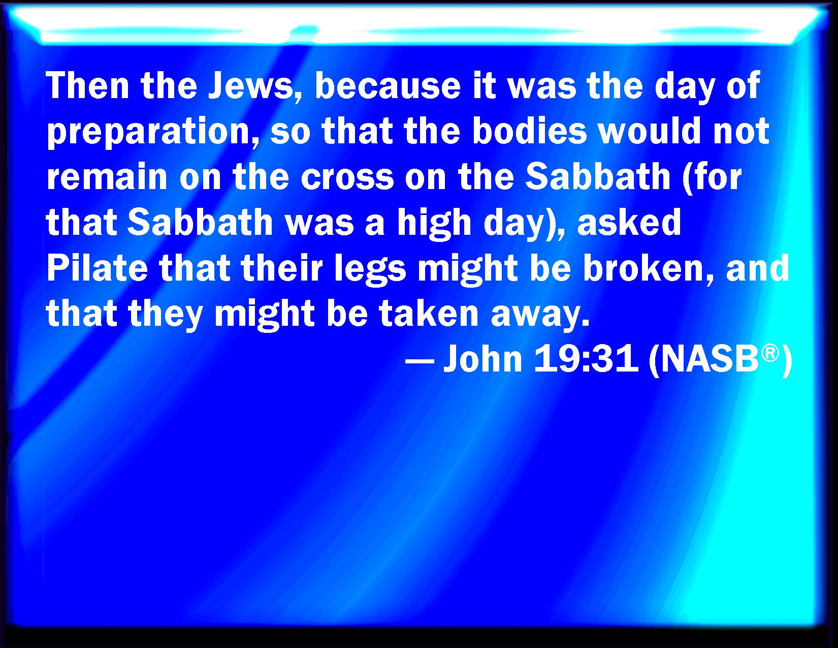 Bible Verse Slide John 19:31 The Jews therefore, because it was the preparation, that the bodies should not remain on the cross on the sabbath day, (for that sabbath day was an high day,) sought Pilate that their legs might be broken, and that they might be taken away. KJV: The Jews therefore, because it was the preparation, that the bodies should not remain upon the cross on the sabbath day, (for that sabbath day was an high day,) besought Pilate that their legs might be broken, and that they might be taken away. DRB: Then the Jews, (because it was the parasceve,) that the bodies might not remain on the cross on the sabbath day, (for that was a great sabbath day,) besought Pilate that their legs might be broken, and that they might be taken away. DBT: The Jews therefore, that the bodies might not remain on the cross on the sabbath, for it was the preparation, (for the day of that sabbath was a great day,) demanded of Pilate that their legs might be broken and they taken away. ERV: The Jews therefore, because it was the Preparation, that the bodies should not remain on the cross upon the sabbath (for the day of that sabbath was a high day), asked of Pilate that their legs might be broken, and that they might be taken away. WBT: The Jews therefore, because it was the preparation, that the bodies should not remain upon the cross on the sabbath, (for that sabbath was a great day,) besought Pilate that their legs might be broken, and that they might be taken away. WEB: Therefore the Jews, because it was the Preparation Day, so that the bodies wouldn't remain on the cross on the Sabbath (for that Sabbath was a special one), asked of Pilate that their legs might be broken, and that they might be taken away. YLT: The Jews, therefore, that the bodies might not remain on the cross on the sabbath, since it was the preparation, (for that sabbath day was a great one,) asked of Pilate that their legs may be broken, and they taken away.Links John 19:31 NIV • John 19:31 NLT • John 19:31 ESV • John 19:31 NASB • John 19:31 KJV • John 19:31 Interlinear • John 19:31 Commentaries • John 19:31 Parallel Texts • John 19:31 Bible Apps • John 19:31 Parallel • Bible Hub |