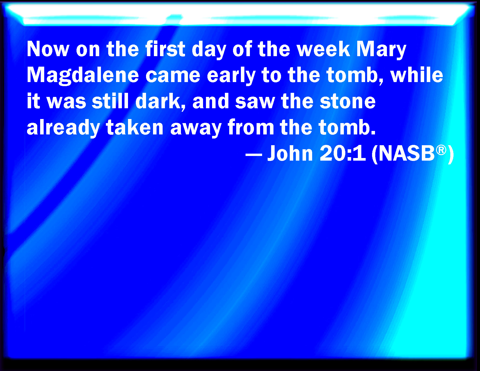 Bible Verse Slide John 20:1 The first day of the week comes Mary Magdalene early, when it was yet dark, to the sepulcher, and sees the stone taken away from the sepulcher. KJV: The first day of the week cometh Mary Magdalene early, when it was yet dark, unto the sepulchre, and seeth the stone taken away from the sepulchre. DRB: AND on the first day of the week, Mary Magdalen cometh early, when it was yet dark, unto the sepulchre; and she saw the stone taken away from the sepulchre. DBT: And on the first day of the week Mary of Magdala comes in early morn to the tomb, while it was still dark, and sees the stone taken away from the tomb. ERV: Now on the first day of the week cometh Mary Magdalene early, while it was yet dark, unto the tomb, and seeth the stone taken away from the tomb. WBT: The first day of the week cometh Mary Magdalene early, when it was yet dark, to the sepulcher, and seeth the stone taken away from the sepulcher. WEB: Now on the first day of the week, Mary Magdalene went early, while it was still dark, to the tomb, and saw the stone taken away from the tomb. YLT: And on the first of the sabbaths, Mary the Magdalene doth come early (there being yet darkness) to the tomb, and she seeth the stone having been taken away out of the tomb,Links John 20:1 NIV • John 20:1 NLT • John 20:1 ESV • John 20:1 NASB • John 20:1 KJV • John 20:1 Interlinear • John 20:1 Commentaries • John 20:1 Parallel Texts • John 20:1 Bible Apps • John 20:1 Parallel • Bible Hub |