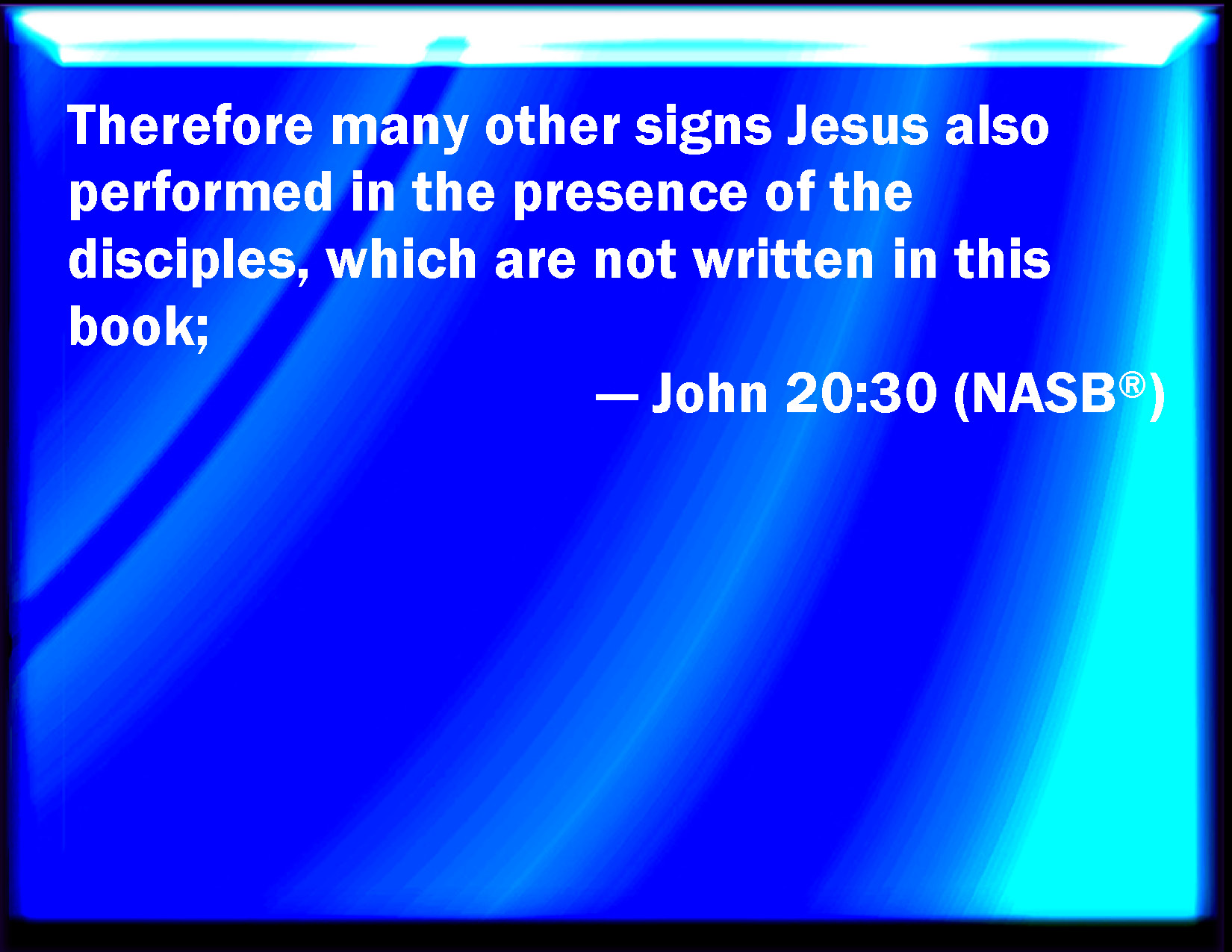 Bible Verse Slide John 20:30 And many other signs truly did Jesus in the presence of his disciples, which are not written in this book: KJV: And many other signs truly did Jesus in the presence of his disciples, which are not written in this book: DRB: Many other signs also did Jesus in the sight of his disciples, which are not written in this book. DBT: Many other signs therefore also Jesus did before his disciples, which are not written in this book; ERV: Many other signs therefore did Jesus in the presence of the disciples, which are not written in this book: WBT: And many other signs truly did Jesus in the presence of his disciples, which are not written in this book. WEB: Therefore Jesus did many other signs in the presence of his disciples, which are not written in this book; YLT: Many indeed, therefore, other signs also did Jesus before his disciples, that are not written in this book;Links John 20:30 NIV • John 20:30 NLT • John 20:30 ESV • John 20:30 NASB • John 20:30 KJV • John 20:30 Interlinear • John 20:30 Commentaries • John 20:30 Parallel Texts • John 20:30 Bible Apps • John 20:30 Parallel • Bible Hub |