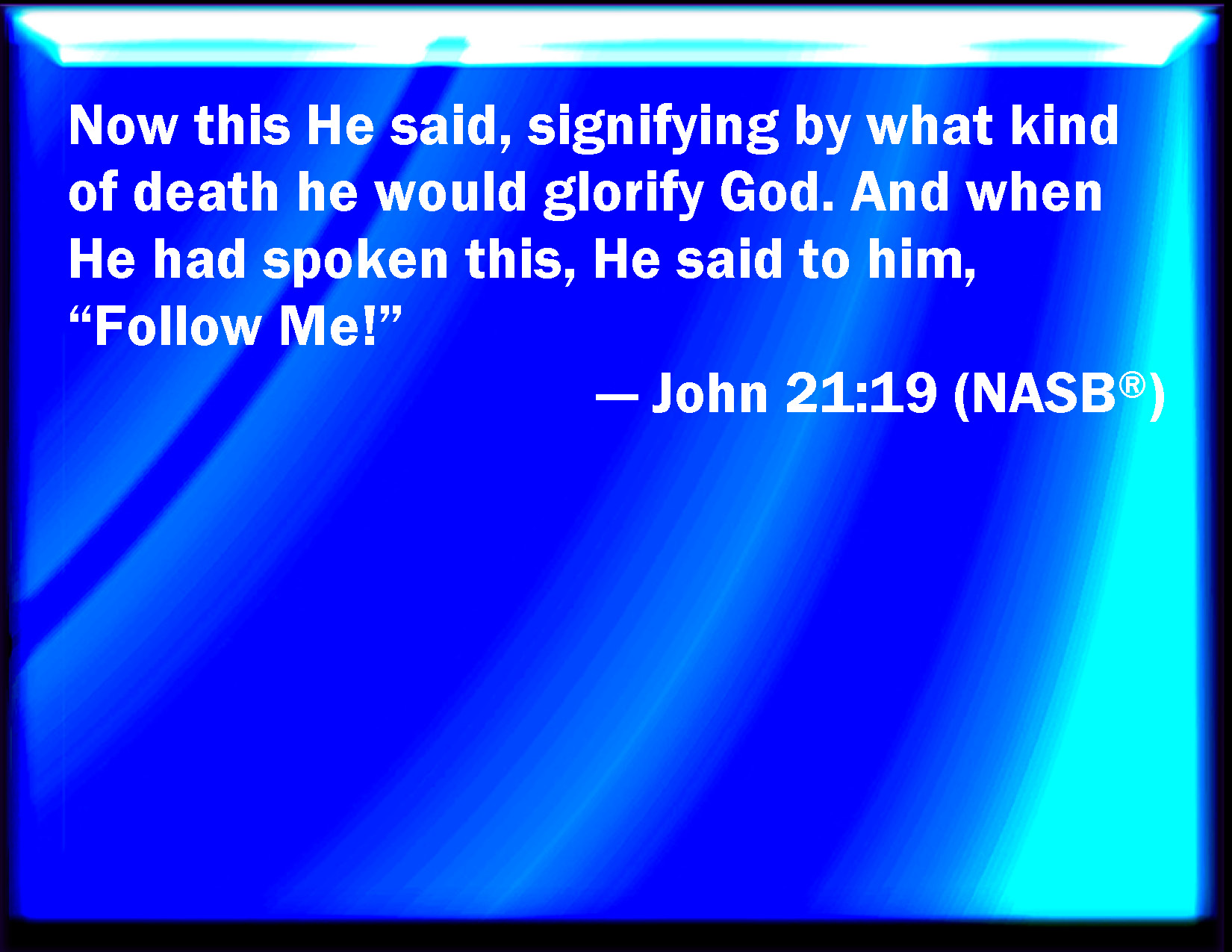 Bible Verse Slide John 21:19 This spoke he, signifying by what death he should glorify God. And when he had spoken this, he said to him, Follow me. KJV: This spake he, signifying by what death he should glorify God. And when he had spoken this, he saith unto him, Follow me. DRB: And this he said, signifying by what death he should glorify God. And when he had said this, he saith to him: Follow me. DBT: But he said this signifying by what death he should glorify God. And having said this, he says to him, Follow me. ERV: Now this he spake, signifying by what manner of death he should glorify God. And when he had spoken this, he saith unto him, Follow me. WBT: This he spoke, signifying by what death he should glorify God. And when he had spoken this, he saith to him, Follow me. WEB: Now he said this, signifying by what kind of death he would glorify God. When he had said this, he said to him, "Follow me." YLT: and this he said, signifying by what death he shall glorify God; and having said this, he saith to him, 'Be following me.'Links John 21:19 NIV • John 21:19 NLT • John 21:19 ESV • John 21:19 NASB • John 21:19 KJV • John 21:19 Interlinear • John 21:19 Commentaries • John 21:19 Parallel Texts • John 21:19 Bible Apps • John 21:19 Parallel • Bible Hub |