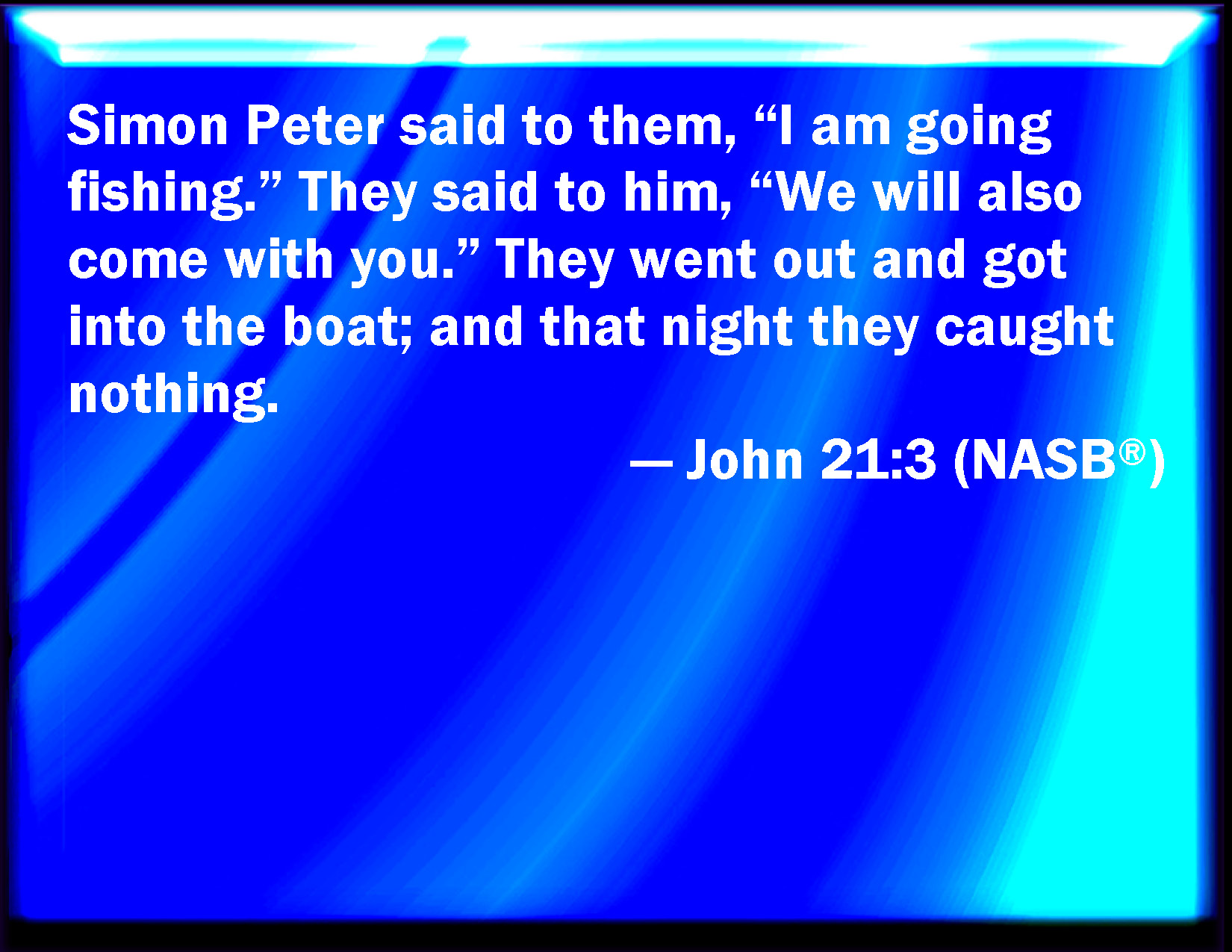 Bible Verse Slide John 21:3 Simon Peter said to them, I go a fishing. They say to him, We also go with you. They went forth, and entered into a ship immediately; and that night they caught nothing. KJV: Simon Peter saith unto them, I go a fishing. They say unto him, We also go with thee. They went forth, and entered into a ship immediately; and that night they caught nothing. DRB: Simon Peter saith to them: I go a fishing. They say to him: We also come with thee. And they went forth, and entered into the ship: and that night they caught nothing. DBT: Simon Peter says to them, I go to fish. They say to him, We also come with thee. They went forth, and went on board, and that night took nothing. ERV: Simon Peter saith unto them, I go a fishing. They say unto him, We also come with thee. They went forth, and entered into the boat; and that night they took nothing. WBT: Simon Peter saith to them, I go a fishing. They say to him, We also go with thee. They went forth, and entered into a boat immediately; and that night they caught nothing. WEB: Simon Peter said to them, "I'm going fishing." They told him, "We are also coming with you." They immediately went out, and entered into the boat. That night, they caught nothing. YLT: Simon Peter saith to them, 'I go away to fish;' they say to him, 'We go — we also — with thee;' they went forth and entered into the boat immediately, and on that night they caught nothing.Links John 21:3 NIV • John 21:3 NLT • John 21:3 ESV • John 21:3 NASB • John 21:3 KJV • John 21:3 Interlinear • John 21:3 Commentaries • John 21:3 Parallel Texts • John 21:3 Bible Apps • John 21:3 Parallel • Bible Hub |