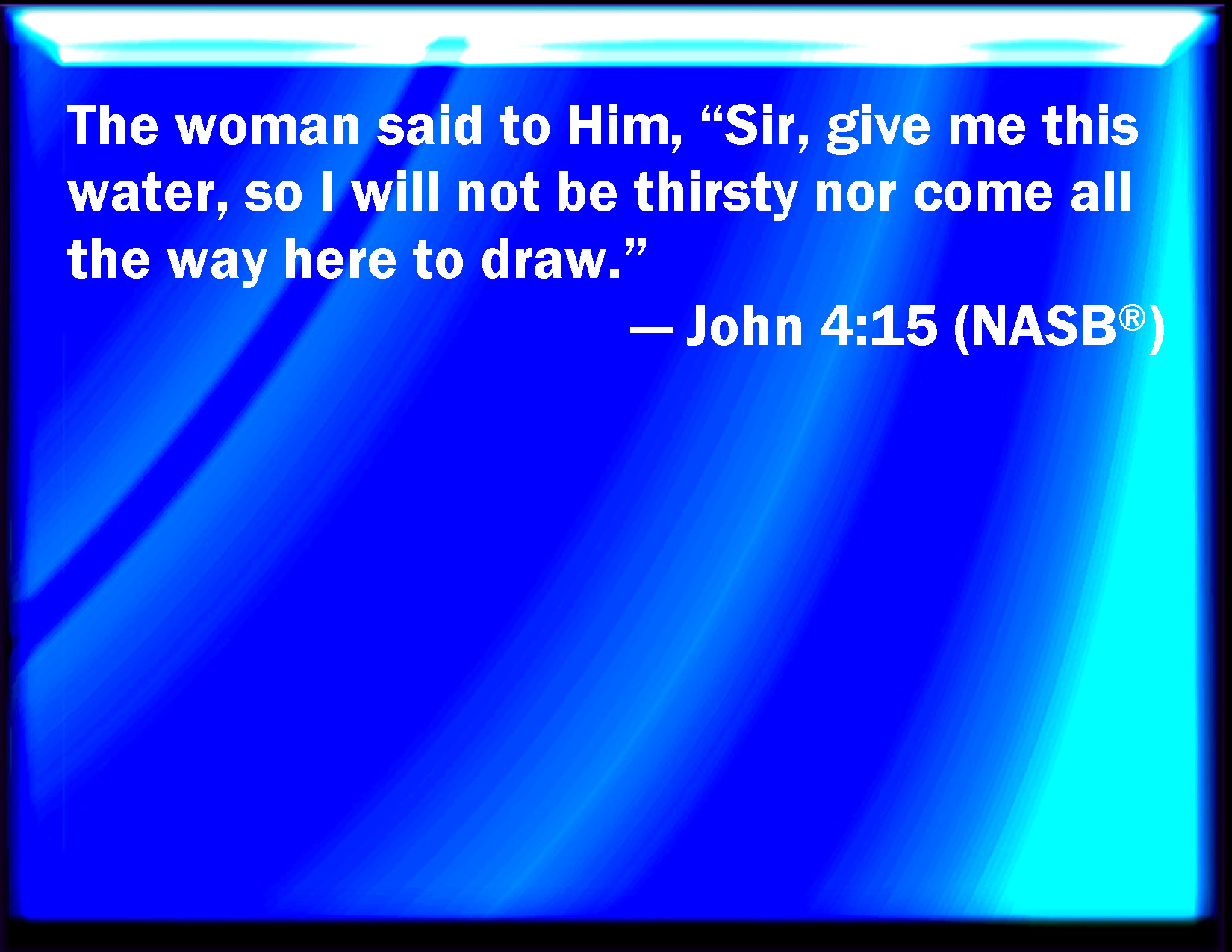 Bible Verse Slide John 4:15 The woman said to him, Sir, give me this water, that I thirst not, neither come here to draw. KJV: The woman saith unto him, Sir, give me this water, that I thirst not, neither come hither to draw. DRB: The woman saith to him: Sir, give me this water, that I may not thirst, nor come hither to draw. DBT: The woman says to him, Sir, give me this water, that I may not thirst nor come here to draw. ERV: The woman saith unto him, Sir, give me this water, that I thirst not, neither come all the way hither to draw. WBT: The woman saith to him, Sir, give me this water, that I may not thirst, neither come hither to draw. WEB: The woman said to him, "Sir, give me this water, so that I don't get thirsty, neither come all the way here to draw." YLT: The woman saith unto him, 'Sir, give me this water, that I may not thirst, nor come hither to draw.'Links John 4:15 NIV • John 4:15 NLT • John 4:15 ESV • John 4:15 NASB • John 4:15 KJV • John 4:15 Interlinear • John 4:15 Commentaries • John 4:15 Parallel Texts • John 4:15 Bible Apps • John 4:15 Parallel • Bible Hub |