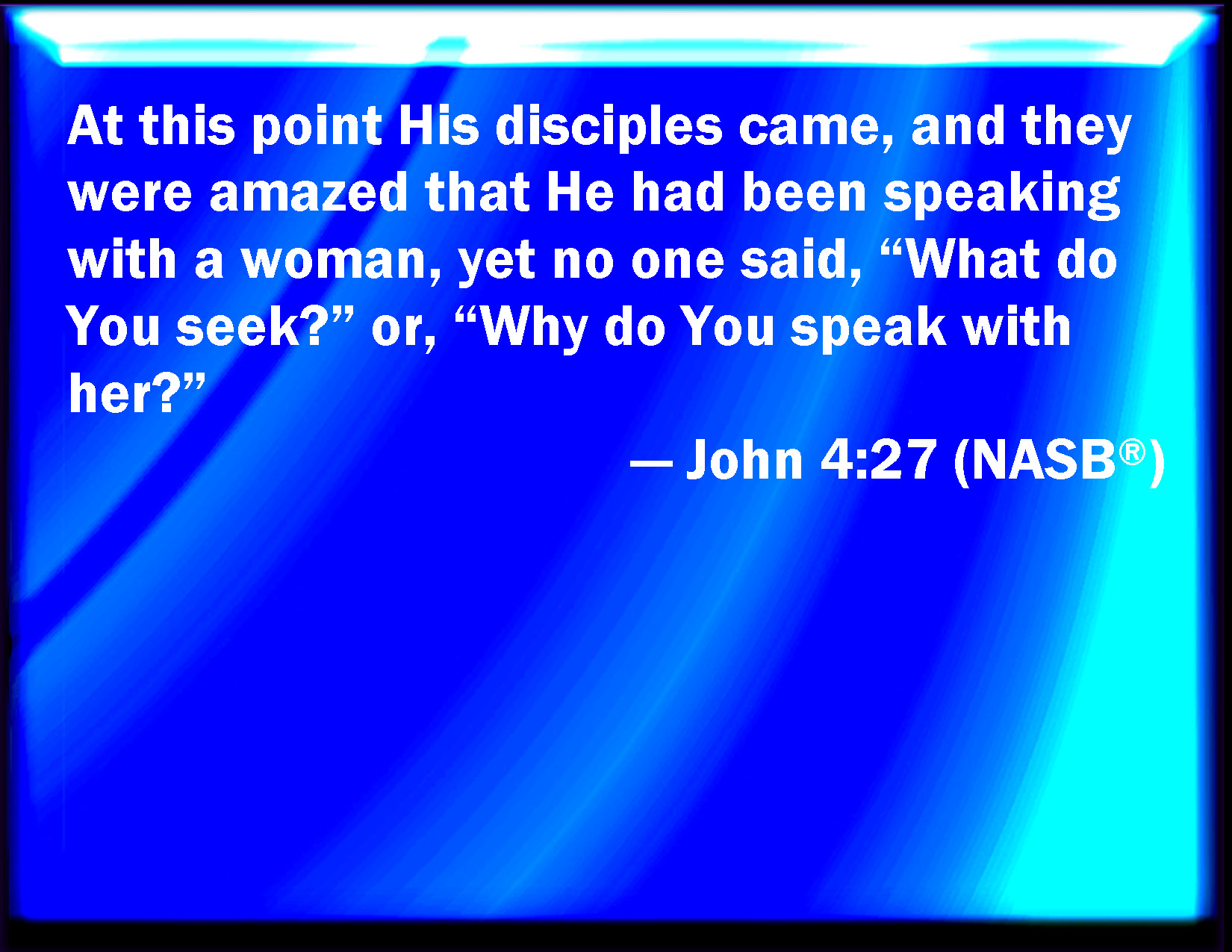 Bible Verse Slide John 4:27 And on this came his disciples, and marveled that he talked with the woman: yet no man said, What seek you? or, Why talk you with her? KJV: And upon this came his disciples, and marvelled that he talked with the woman: yet no man said, What seekest thou? or, Why talkest thou with her? DRB: And immediately his disciples came; and they wondered that he talked with the woman. Yet no man said: What seekest thou? or, why talkest thou with her? DBT: And upon this came his disciples, and wondered that he spoke with a woman; yet no one said, What seekest thou? or, Why speakest thou with her? ERV: And upon this came his disciples; and they marveled that he was speaking with a woman; yet no man said, What seekest thou? or, Why speakest thou with her? WBT: And upon this came his disciples, and marveled that he talked with the woman: yet no man said, What seekest thou? or, Why talkest thou with her? WEB: At this, his disciples came. They marveled that he was speaking with a woman; yet no one said, "What are you looking for?" or, "Why do you speak with her?" YLT: And upon this came his disciples, and were wondering that with a woman he was speaking, no one, however, said, 'What seekest thou?' or 'Why speakest thou with her?'Links John 4:27 NIV • John 4:27 NLT • John 4:27 ESV • John 4:27 NASB • John 4:27 KJV • John 4:27 Interlinear • John 4:27 Commentaries • John 4:27 Parallel Texts • John 4:27 Bible Apps • John 4:27 Parallel • Bible Hub |