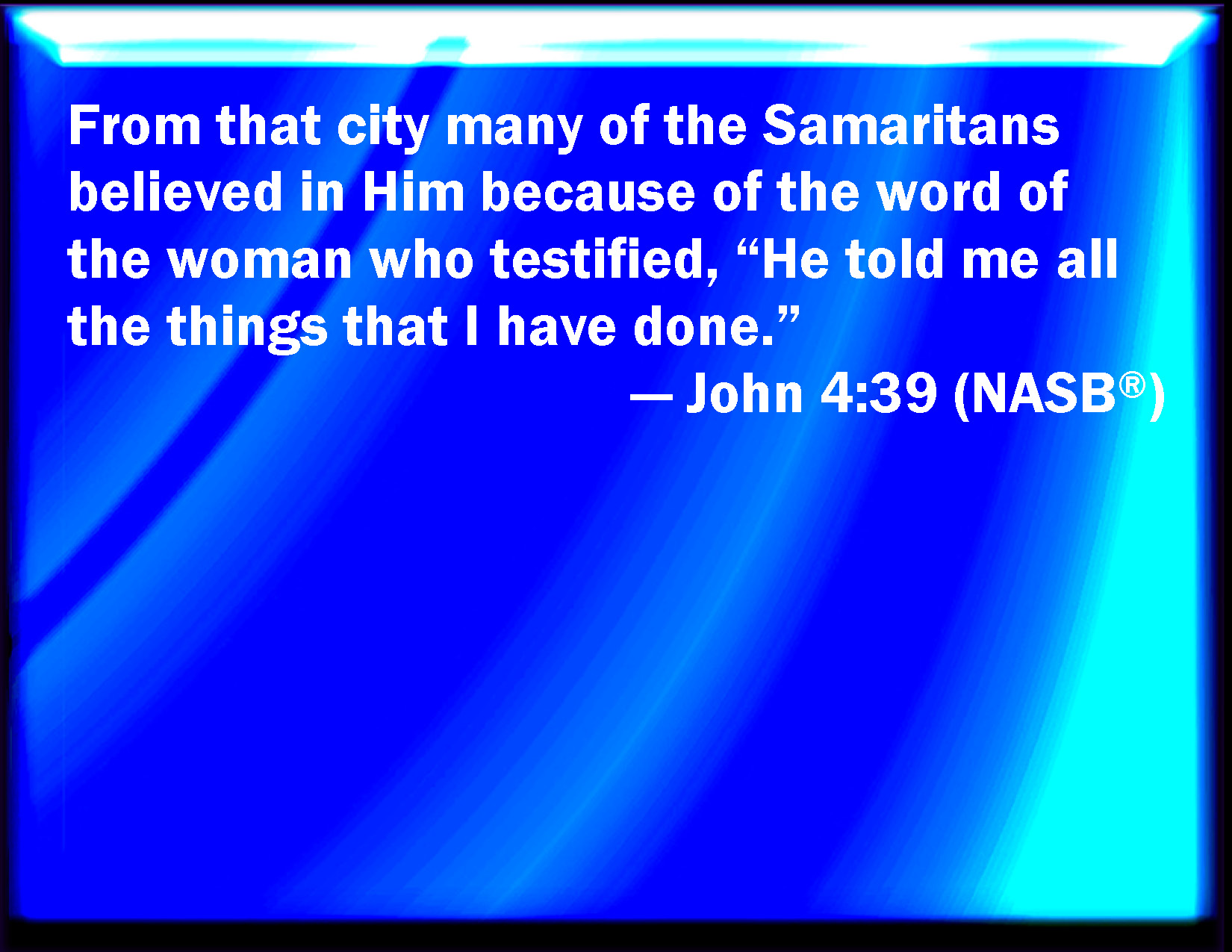 Bible Verse Slide John 4:39 And many of the Samaritans of that city believed on him for the saying of the woman, which testified, He told me all that ever I did. KJV: And many of the Samaritans of that city believed on him for the saying of the woman, which testified, He told me all that ever I did. DRB: Now of that city many of the Samaritans believed in him, for the word of the woman giving testimony: He told me all things whatsoever I have done. DBT: But many of the Samaritans of that city believed on him because of the word of the woman who bore witness, He told me all things that I had ever done. ERV: And from that city many of the Samaritans believed on him because of the word of the woman, who testified, He told me all things that ever I did. WBT: And many of the Samaritans of that city believed on him for the saying of the woman, who testified, He told me all that ever I did. WEB: From that city many of the Samaritans believed in him because of the word of the woman, who testified, "He told me everything that I did." YLT: And from that city many believed in him, of the Samaritans, because of the word of the woman testifying, — 'He told me all things — as many as I did.'Links John 4:39 NIV • John 4:39 NLT • John 4:39 ESV • John 4:39 NASB • John 4:39 KJV • John 4:39 Interlinear • John 4:39 Commentaries • John 4:39 Parallel Texts • John 4:39 Bible Apps • John 4:39 Parallel • Bible Hub |