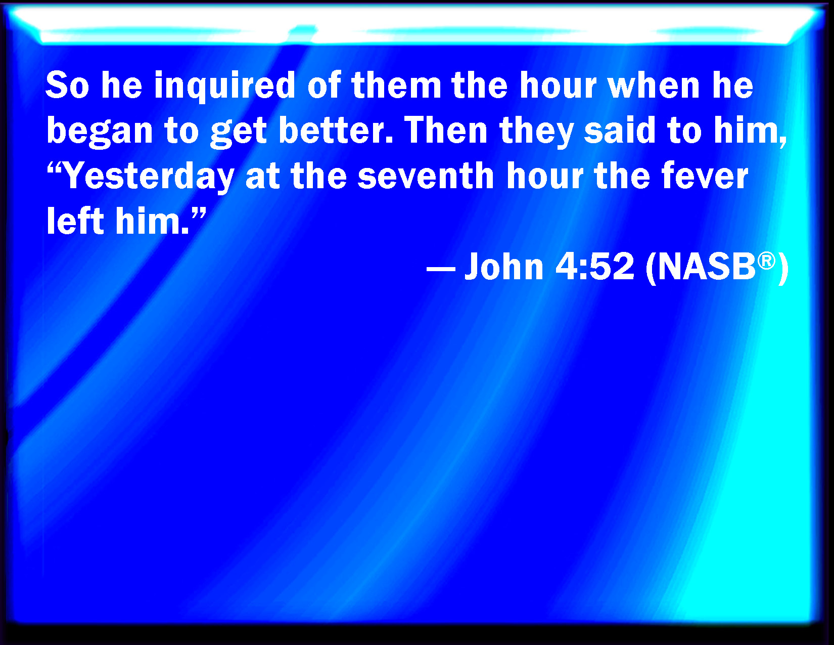 Bible Verse Slide John 4:52 Then inquired he of them the hour when he began to amend. And they said to him, Yesterday at the seventh hour the fever left him. KJV: Then inquired he of them the hour when he began to amend. And they said unto him, Yesterday at the seventh hour the fever left him. DRB: He asked therefore of them the hour wherein he grew better. And they said to him: Yesterday, at the seventh hour, the fever left him. DBT: He inquired therefore from them the hour at which he got better. And they said to him, Yesterday at the seventh hour the fever left him. ERV: So he inquired of them the hour when he began to amend. They said therefore unto him, Yesterday at the seventh hour the fever left him. WBT: Then he inquired of them the hour when he began to amend: and they said to him, Yesterday at the seventh hour the fever left him. WEB: So he inquired of them the hour when he began to get better. They said therefore to him, "Yesterday at the seventh hour, the fever left him." YLT: he inquired then of them the hour in which he became better, and they said to him — 'Yesterday at the seventh hour the fever left him;'Links John 4:52 NIV • John 4:52 NLT • John 4:52 ESV • John 4:52 NASB • John 4:52 KJV • John 4:52 Interlinear • John 4:52 Commentaries • John 4:52 Parallel Texts • John 4:52 Bible Apps • John 4:52 Parallel • Bible Hub |