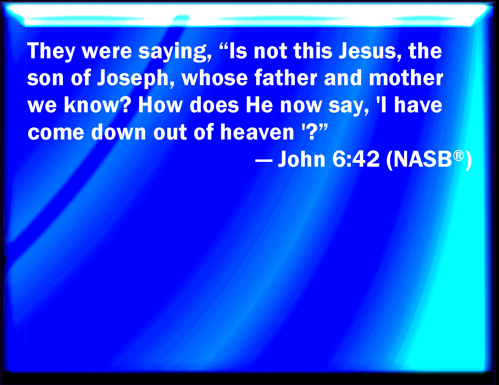 Bible Verse Slide John 6:42 And they said, Is not this Jesus, the son of Joseph, whose father and mother we know? how is it then that he said, I came down from heaven? KJV: And they said, Is not this Jesus, the son of Joseph, whose father and mother we know? how is it then that he saith, I came down from heaven? DRB: And they said: Is not this Jesus, the son of Joseph, whose father and mother we know? How then saith he, I came down from heaven? DBT: And they said, Is not this Jesus the son of Joseph, whose father and mother we have known? how then does he say, I am come down out of heaven? ERV: And they said, Is not this Jesus, the son of Joseph, whose father and mother we know? how doth he now say, I am come down out of heaven? WBT: And they said, Is not this Jesus the son of Joseph, whose father and mother we know? how is it then that he saith, I came down from heaven? WEB: They said, "Isn't this Jesus, the son of Joseph, whose father and mother we know? How then does he say, 'I have come down out of heaven?'" YLT: and they said, 'Is not this Jesus, the son of Joseph, whose father and mother we have known? how then saith this one — Out of the heaven I have come down?'Links John 6:42 NIV • John 6:42 NLT • John 6:42 ESV • John 6:42 NASB • John 6:42 KJV • John 6:42 Interlinear • John 6:42 Commentaries • John 6:42 Parallel Texts • John 6:42 Bible Apps • John 6:42 Parallel • Bible Hub |