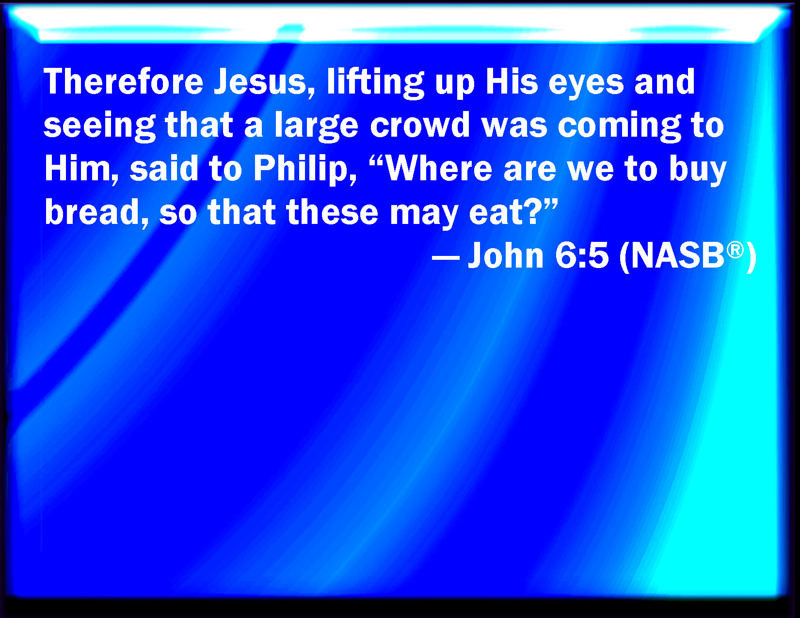 Bible Verse Slide John 6:5 When Jesus then lifted up his eyes, and saw a great company come to him, he said to Philip, From where shall we buy bread, that these may eat? KJV: When Jesus then lifted up his eyes, and saw a great company come unto him, he saith unto Philip, Whence shall we buy bread, that these may eat? DRB: When Jesus therefore had lifted up his eyes, and seen that a very great multitude cometh to him, he said to Philip: Whence shall we buy bread, that these may eat? DBT: Jesus then, lifting up his eyes and seeing that a great crowd is coming to him, says to Philip, Whence shall we buy loaves that these may eat? ERV: Jesus therefore lifting up his eyes, and seeing that a great multitude cometh unto him, saith unto Philip, Whence are we to buy bread, that these may eat? WBT: When Jesus then lifted up his eyes, and saw a great company come to him, he saith to Philip, Whence shall we buy bread that these may eat? WEB: Jesus therefore lifting up his eyes, and seeing that a great multitude was coming to him, said to Philip, "Where are we to buy bread, that these may eat?" YLT: Jesus then having lifted up his eyes and having seen that a great multitude doth come to him, saith unto Philip, 'Whence shall we buy loaves, that these may eat?' — Links John 6:5 NIV • John 6:5 NLT • John 6:5 ESV • John 6:5 NASB • John 6:5 KJV • John 6:5 Interlinear • John 6:5 Commentaries • John 6:5 Parallel Texts • John 6:5 Bible Apps • John 6:5 Parallel • Bible Hub |