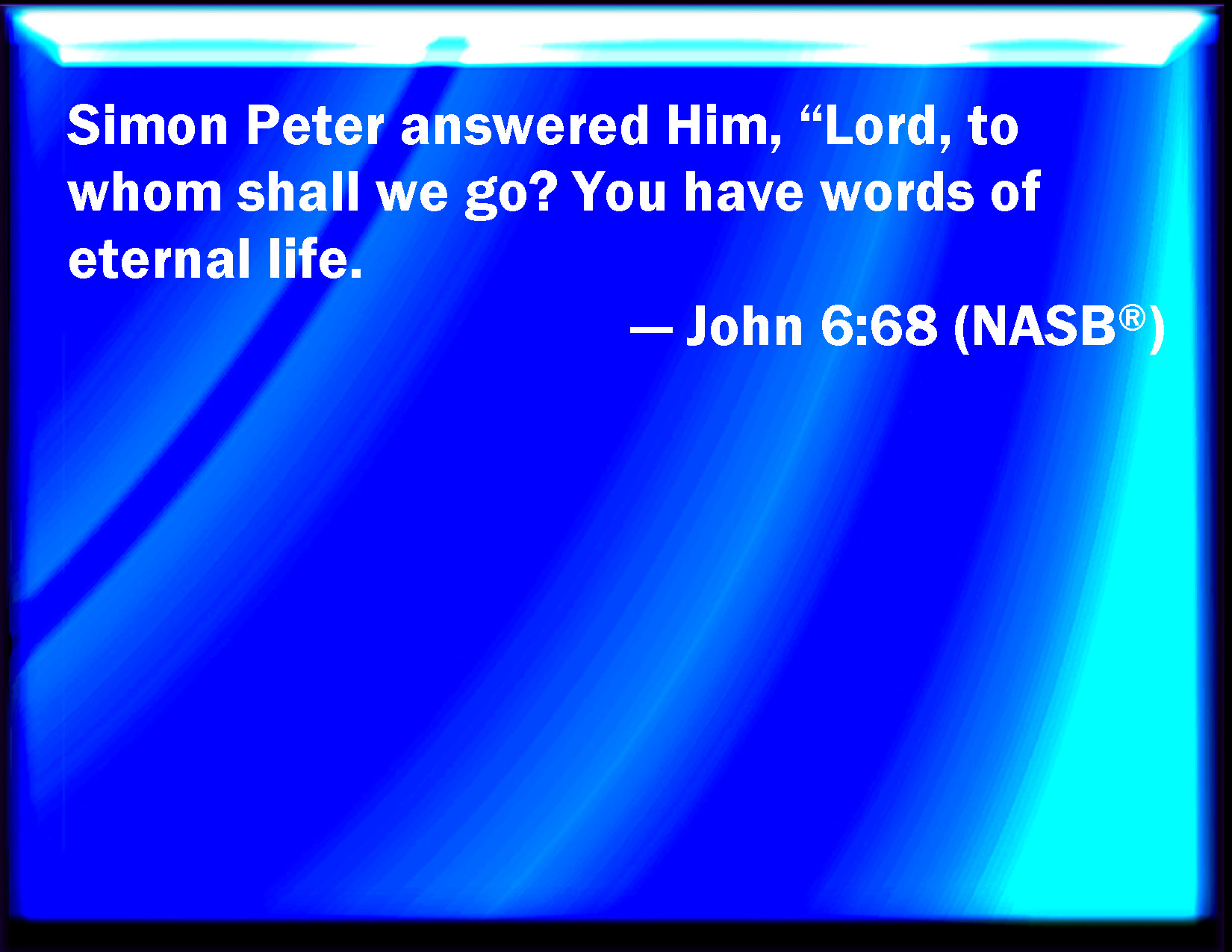 Bible Verse Slide John 6:68 Then Simon Peter answered him, Lord, to whom shall we go? you have the words of eternal life. KJV: Then Simon Peter answered him, Lord, to whom shall we go? thou hast the words of eternal life. DRB: And Simon Peter answered him: Lord, to whom shall we go? thou hast the words of eternal life. DBT: Simon Peter answered him, Lord, to whom shall we go? thou hast words of life eternal; ERV: Simon Peter answered him, Lord, to whom shall we go? thou hast the words of eternal life. WBT: Then Simon Peter answered him, Lord, to whom shall we go? thou hast the words of eternal life. WEB: Simon Peter answered him, "Lord, to whom would we go? You have the words of eternal life. YLT: Simon Peter, therefore, answered him, 'Sir, unto whom shall we go? thou hast sayings of life age-during;Links John 6:68 NIV • John 6:68 NLT • John 6:68 ESV • John 6:68 NASB • John 6:68 KJV • John 6:68 Interlinear • John 6:68 Commentaries • John 6:68 Parallel Texts • John 6:68 Bible Apps • John 6:68 Parallel • Bible Hub |
