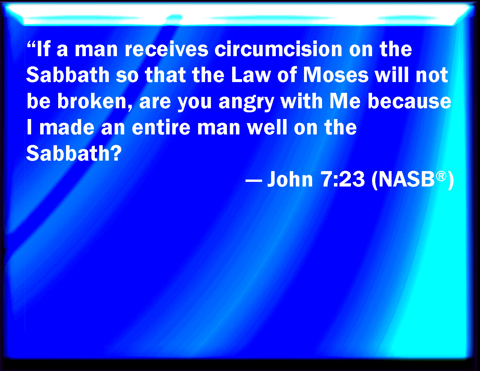Bible Verse Slide John 7:23 If a man on the sabbath day receive circumcision, that the law of Moses should not be broken; are you angry at me, because I have made a man every whit whole on the sabbath day? KJV: If a man on the sabbath day receive circumcision, that the law of Moses should not be broken; are ye angry at me, because I have made a man every whit whole on the sabbath day? DRB: If a man receive circumcision on the sabbath day, that the law of Moses may not be broken; are you angry at me because I have healed the whole man on the sabbath day? DBT: If a man receives circumcision on sabbath, that the law of Moses may not be violated, are ye angry with me because I have made a man entirely sound on sabbath? ERV: If a man receiveth circumcision on the sabbath, that the law of Moses may not be broken; are ye wroth with me, because I made a man every whit whole on the sabbath? WBT: If a man on the sabbath receiveth circumcision, that the law of Moses should not be broken; are ye angry at me, because I have restored a man to sound health on the sabbath? WEB: If a boy receives circumcision on the Sabbath, that the law of Moses may not be broken, are you angry with me, because I made a man completely healthy on the Sabbath? YLT: if a man doth receive circumcision on a sabbath that the law of Moses may not be broken, are ye wroth with me that I made a man all whole on a sabbath?Links John 7:23 NIV • John 7:23 NLT • John 7:23 ESV • John 7:23 NASB • John 7:23 KJV • John 7:23 Interlinear • John 7:23 Commentaries • John 7:23 Parallel Texts • John 7:23 Bible Apps • John 7:23 Parallel • Bible Hub |
