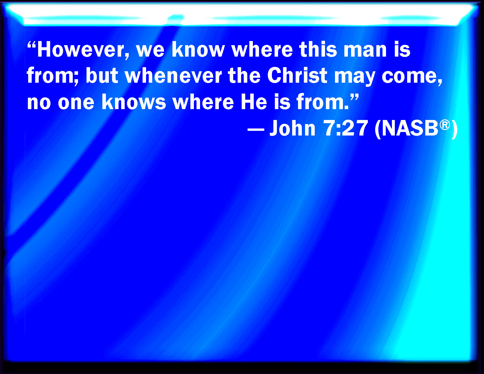 Bible Verse Slide John 7:27 However, we know this man from where he is: but when Christ comes, no man knows from where he is. KJV: Howbeit we know this man whence he is: but when Christ cometh, no man knoweth whence he is. DRB: But we know this man, whence he is: but when the Christ cometh, no man knoweth whence he is. DBT: But as to this man we know whence he is. Now as to the Christ, when he comes, no one knows whence he is. ERV: Howbeit we know this man whence he is: but when the Christ cometh, no one knoweth whence he is. WBT: But we know this man, whence he is: whereas when Christ cometh, no man knoweth whence he is. WEB: However we know where this man comes from, but when the Christ comes, no one will know where he comes from." YLT: but this one — we have known whence he is; and the Christ, when he doth come, no one doth know whence he is.'Links John 7:27 NIV • John 7:27 NLT • John 7:27 ESV • John 7:27 NASB • John 7:27 KJV • John 7:27 Interlinear • John 7:27 Commentaries • John 7:27 Parallel Texts • John 7:27 Bible Apps • John 7:27 Parallel • Bible Hub |