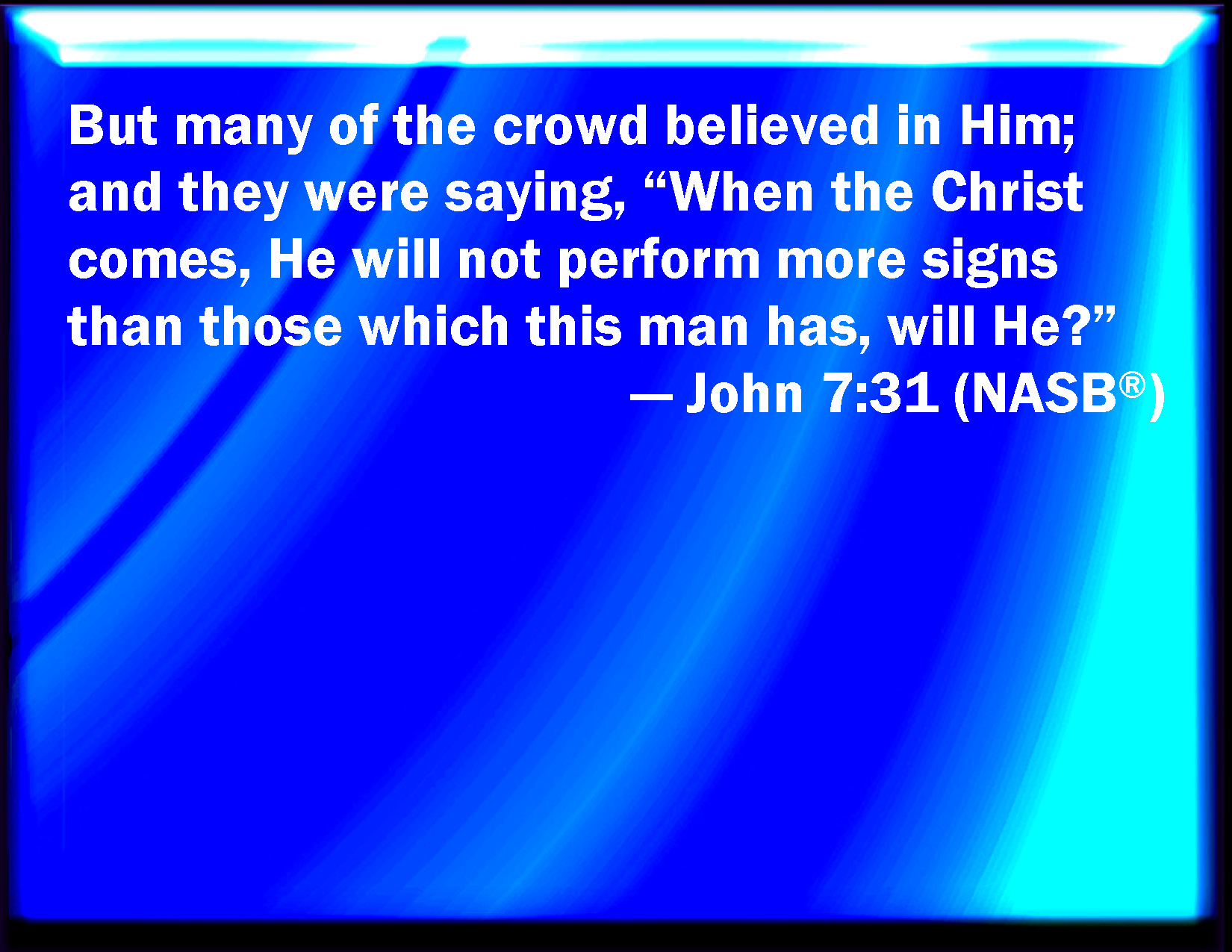 Bible Verse Slide John 7:31 And many of the people believed on him, and said, When Christ comes, will he do more miracles than these which this man has done? KJV: And many of the people believed on him, and said, When Christ cometh, will he do more miracles than these which this man hath done? DRB: But of the people many believed in him, and said: When the Christ cometh, shall he do more miracles, than these which this man doth? DBT: But many of the crowd believed on him, and said, Will the Christ, when he comes, do more signs than those which this man has done? ERV: But of the multitude many believed on him; and they said, When the Christ shall come, will he do more signs than those which this man hath done? WBT: And many of the people believed on him, and said, When Christ cometh, will he do more miracles than these which this man hath done? WEB: But of the multitude, many believed in him. They said, "When the Christ comes, he won't do more signs than those which this man has done, will he?" YLT: and many out of the multitude did believe in him, and said — 'The Christ — when he may come — will he do more signs than these that this one did?'Links John 7:31 NIV • John 7:31 NLT • John 7:31 ESV • John 7:31 NASB • John 7:31 KJV • John 7:31 Interlinear • John 7:31 Commentaries • John 7:31 Parallel Texts • John 7:31 Bible Apps • John 7:31 Parallel • Bible Hub |
