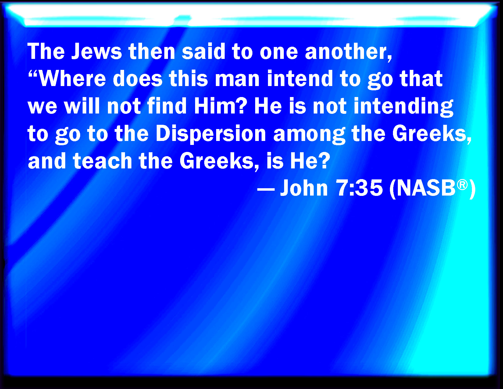 Bible Verse Slide John 7:35 Then said the Jews among themselves, Where will he go, that we shall not find him? will he go to the dispersed among the Gentiles, and teach the Gentiles? KJV: Then said the Jews among themselves, Whither will he go, that we shall not find him? will he go unto the dispersed among the Gentiles, and teach the Gentiles? DRB: The Jews therefore said among themselves: Whither will he go, that we shall not find him? will he go unto the dispersed among the Gentiles, and teach the Gentiles? DBT: The Jews therefore said to one another, Where is he about to go that we shall not find him? Is he about to go to the dispersion among the Greeks, and teach the Greeks? ERV: The Jews therefore said among themselves, Whither will this man go that we shall not find him? will he go unto the Dispersion among the Greeks, and teach the Greeks? WBT: Then said the Jews among themselves, Whither will he go, that we shall not find him? will he go to the dispersed among the Gentiles, and teach the Gentiles? WEB: The Jews therefore said among themselves, "Where will this man go that we won't find him? Will he go to the Dispersion among the Greeks, and teach the Greeks? YLT: The Jews, therefore, said among themselves, 'Whither is this one about to go that we shall not find him? — to the dispersion of the Greeks is he about to go? and to teach the Greeks;Links John 7:35 NIV • John 7:35 NLT • John 7:35 ESV • John 7:35 NASB • John 7:35 KJV • John 7:35 Interlinear • John 7:35 Commentaries • John 7:35 Parallel Texts • John 7:35 Bible Apps • John 7:35 Parallel • Bible Hub |