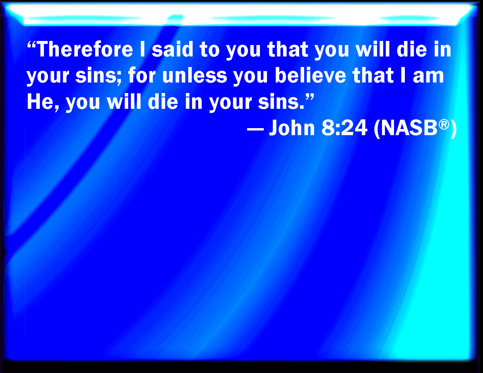 Bible Verse Slide John 8:24 I said therefore to you, that you shall die in your sins: for if you believe not that I am he, you shall die in your sins. KJV: I said therefore unto you, that ye shall die in your sins: for if ye believe not that I am he, ye shall die in your sins. DRB: Therefore I said to you, that you shall die in your sins. For if you believe not that I am he, you shall die in your sin. DBT: I said therefore to you, that ye shall die in your sins; for unless ye shall believe that I am he, ye shall die in your sins. ERV: I said therefore unto you, that ye shall die in your sins: for except ye believe that I am he, ye shall die in your sins. WBT: I said therefore to you, that ye will die in your sins: for if ye believe not that I am he, ye will die in your sins. WEB: I said therefore to you that you will die in your sins; for unless you believe that I am he, you will die in your sins." YLT: I said, therefore, to you, that ye shall die in your sins, for if ye may not believe that I am he, ye shall die in your sins.'Links John 8:24 NIV • John 8:24 NLT • John 8:24 ESV • John 8:24 NASB • John 8:24 KJV • John 8:24 Interlinear • John 8:24 Commentaries • John 8:24 Parallel Texts • John 8:24 Bible Apps • John 8:24 Parallel • Bible Hub |
