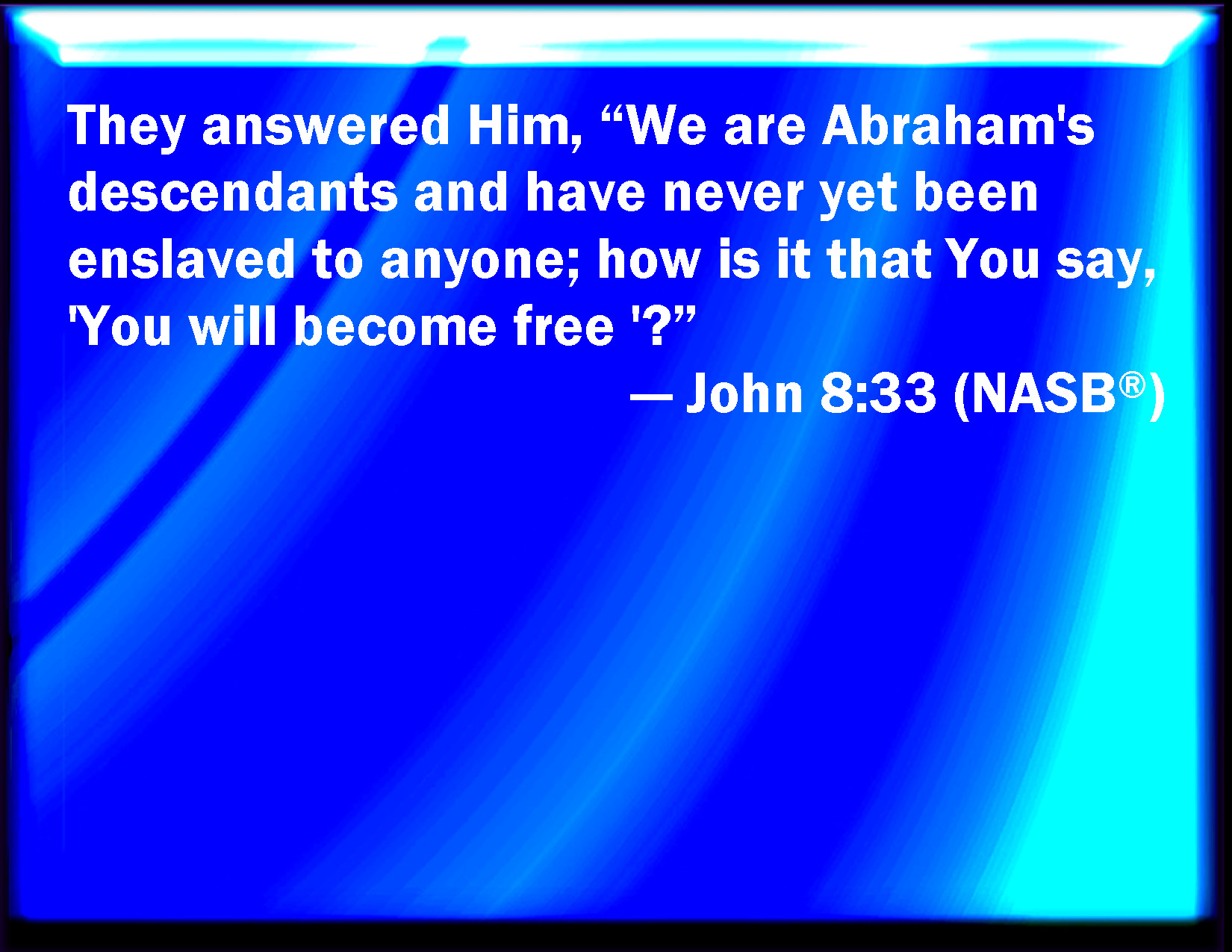 Bible Verse Slide John 8:33 They answered him, We be Abraham's seed, and were never in bondage to any man: how say you, You shall be made free? KJV: They answered him, We be Abraham's seed, and were never in bondage to any man: how sayest thou, Ye shall be made free? DRB: They answered him: We are the seed of Abraham, and we have never been slaves to any man: how sayest thou: you shall be free? DBT: They answered him, We are Abraham's seed, and have never been under bondage to any one; how sayest thou, Ye shall become free? ERV: They answered unto him, We be Abraham's seed, and have never yet been in bondage to any man: how sayest thou, Ye shall be made free? WBT: They answered him, We are Abraham's offspring, and were never in bondage to any man: how sayest thou, Ye shall be made free? WEB: They answered him, "We are Abraham's seed, and have never been in bondage to anyone. How do you say, 'You will be made free?'" YLT: They answered him, 'Seed of Abraham we are; and to no one have we been servants at any time; how dost thou say — Ye shall become free?'Links John 8:33 NIV • John 8:33 NLT • John 8:33 ESV • John 8:33 NASB • John 8:33 KJV • John 8:33 Interlinear • John 8:33 Commentaries • John 8:33 Parallel Texts • John 8:33 Bible Apps • John 8:33 Parallel • Bible Hub |