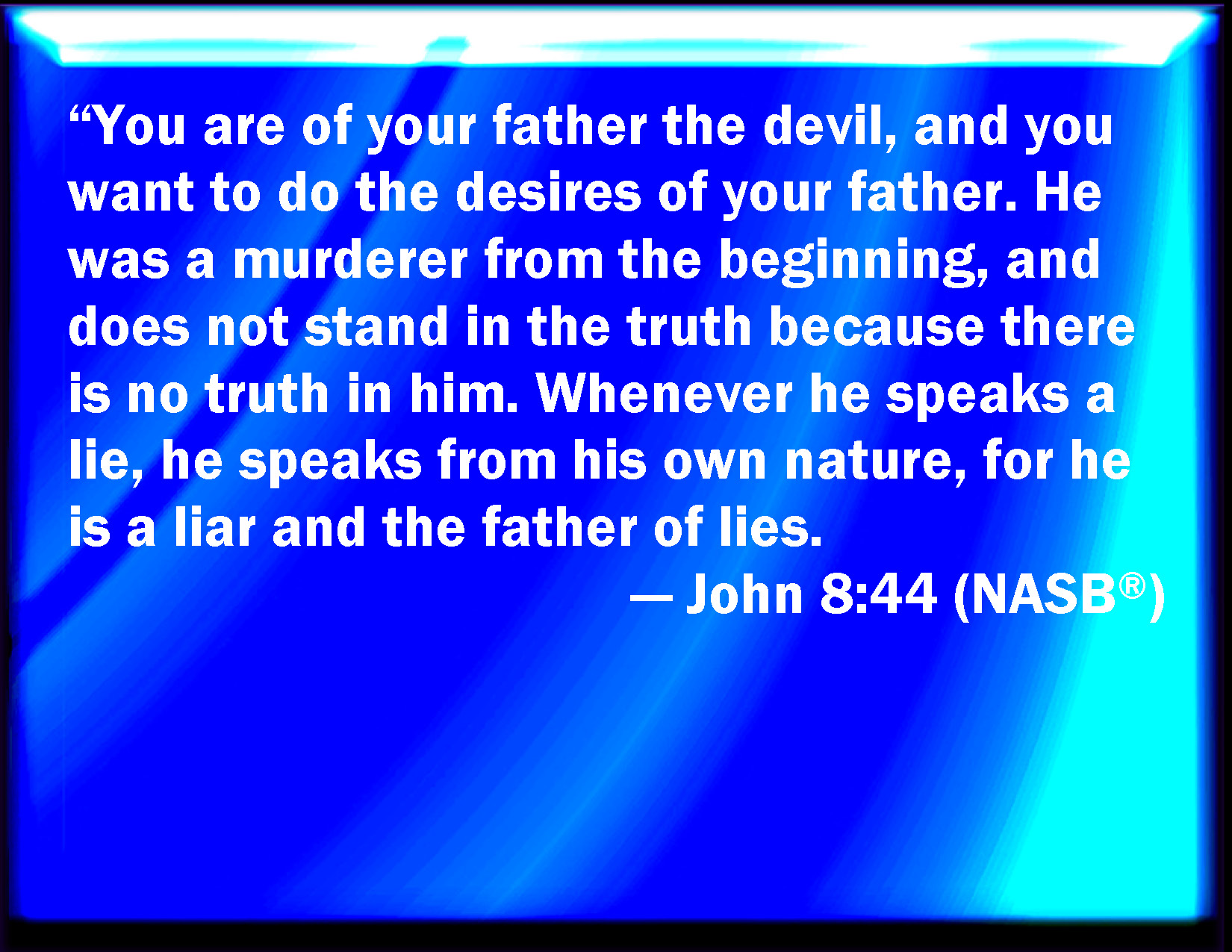 Bible Verse Slide John 8:44 You are of your father the devil, and the lusts of your father you will do. He was a murderer from the beginning, and stayed not in the truth, because there is no truth in him. When he speaks a lie, he speaks of his own: for he is a liar, and the father of it. KJV: Ye are of your father the devil, and the lusts of your father ye will do. He was a murderer from the beginning, and abode not in the truth, because there is no truth in him. When he speaketh a lie, he speaketh of his own: for he is a liar, and the father of it. DRB: You are of your father the devil, and the desires of your father you will do. He was a murderer from the beginning, and he stood not in the truth; because truth is not in him. When he speaketh a lie, he speaketh of his own: for he is a liar, and the father thereof. DBT: Ye are of the devil, as your father, and ye desire to do the lusts of your father. He was a murderer from the beginning, and has not stood in the truth, because there is no truth in him. When he speaks falsehood, he speaks of what is his own; for he is a liar and its father: ERV: Ye are of your father the devil, and the lusts of your father it is your will to do. He was a murderer from the beginning, and stood not in the truth, because there is no truth in him. When he speaketh a lie, he speaketh of his own: for he is a liar, and the father thereof. WBT: Ye are of your father the devil, and the lusts of your father ye will do: he was a murderer from the beginning, and abode not in the truth, because there is no truth in him. When he speaketh a lie, he speaketh of his own: for he is a liar, and the father of it. WEB: You are of your father, the devil, and you want to do the desires of your father. He was a murderer from the beginning, and doesn't stand in the truth, because there is no truth in him. When he speaks a lie, he speaks on his own; for he is a liar, and its father. YLT: Ye are of a father — the devil, and the desires of your father ye will to do; he was a man-slayer from the beginning, and in the truth he hath not stood, because there is no truth in him; when one may speak the falsehood, of his own he speaketh, because he is a liar — also his father.Links John 8:44 NIV • John 8:44 NLT • John 8:44 ESV • John 8:44 NASB • John 8:44 KJV • John 8:44 Interlinear • John 8:44 Commentaries • John 8:44 Parallel Texts • John 8:44 Bible Apps • John 8:44 Parallel • Bible Hub |