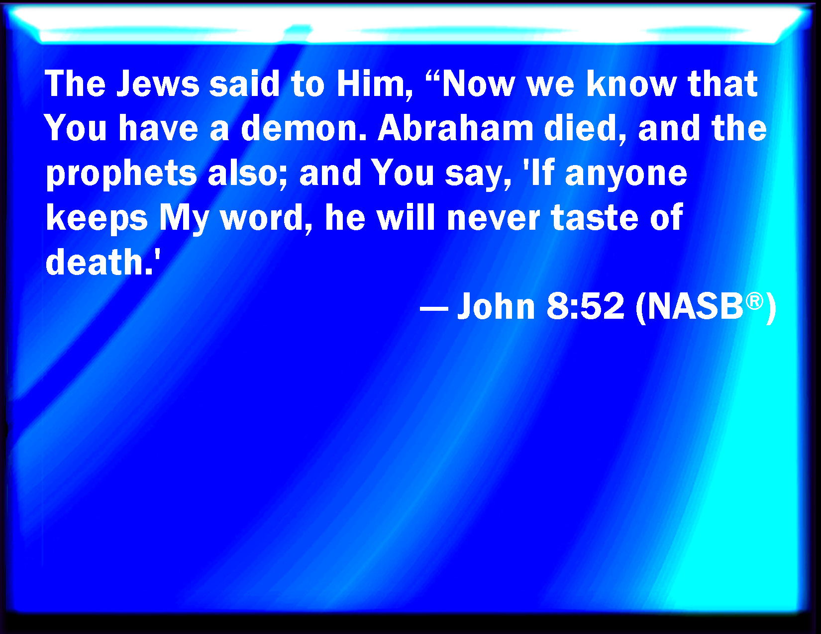 Bible Verse Slide John 8:52 Then said the Jews to him, Now we know that you have a devil. Abraham is dead, and the prophets; and you say, If a man keep my saying, he shall never taste of death. KJV: Then said the Jews unto him, Now we know that thou hast a devil. Abraham is dead, and the prophets; and thou sayest, If a man keep my saying, he shall never taste of death. DRB: The Jews therefore said: Now we know that thou hast a devil. Abraham is dead, and the prophets; and thou sayest: If any man keep my word, he shall not taste death for ever. DBT: The Jews therefore said to him, Now we know that thou hast a demon. Abraham has died, and the prophets, and thou sayest, If any one keep my word, he shall never taste death. ERV: The Jews said unto him, Now we know that thou hast a devil. Abraham is dead, and the prophets; and thou sayest, If a man keep my word, he shall never taste of death. WBT: Then said the Jews to him, Now we know that thou hast a demon. Abraham is dead, and the prophets; and thou sayest, If a man shall keep my saying, he shall never taste death. WEB: Then the Jews said to him, "Now we know that you have a demon. Abraham died, and the prophets; and you say, 'If a man keeps my word, he will never taste of death.' YLT: The Jews, therefore, said to him, 'Now we have known that thou hast a demon; Abraham did die, and the prophets, and thou dost say, If any one may keep my word, he shall not taste of death — to the age!Links John 8:52 NIV • John 8:52 NLT • John 8:52 ESV • John 8:52 NASB • John 8:52 KJV • John 8:52 Interlinear • John 8:52 Commentaries • John 8:52 Parallel Texts • John 8:52 Bible Apps • John 8:52 Parallel • Bible Hub |