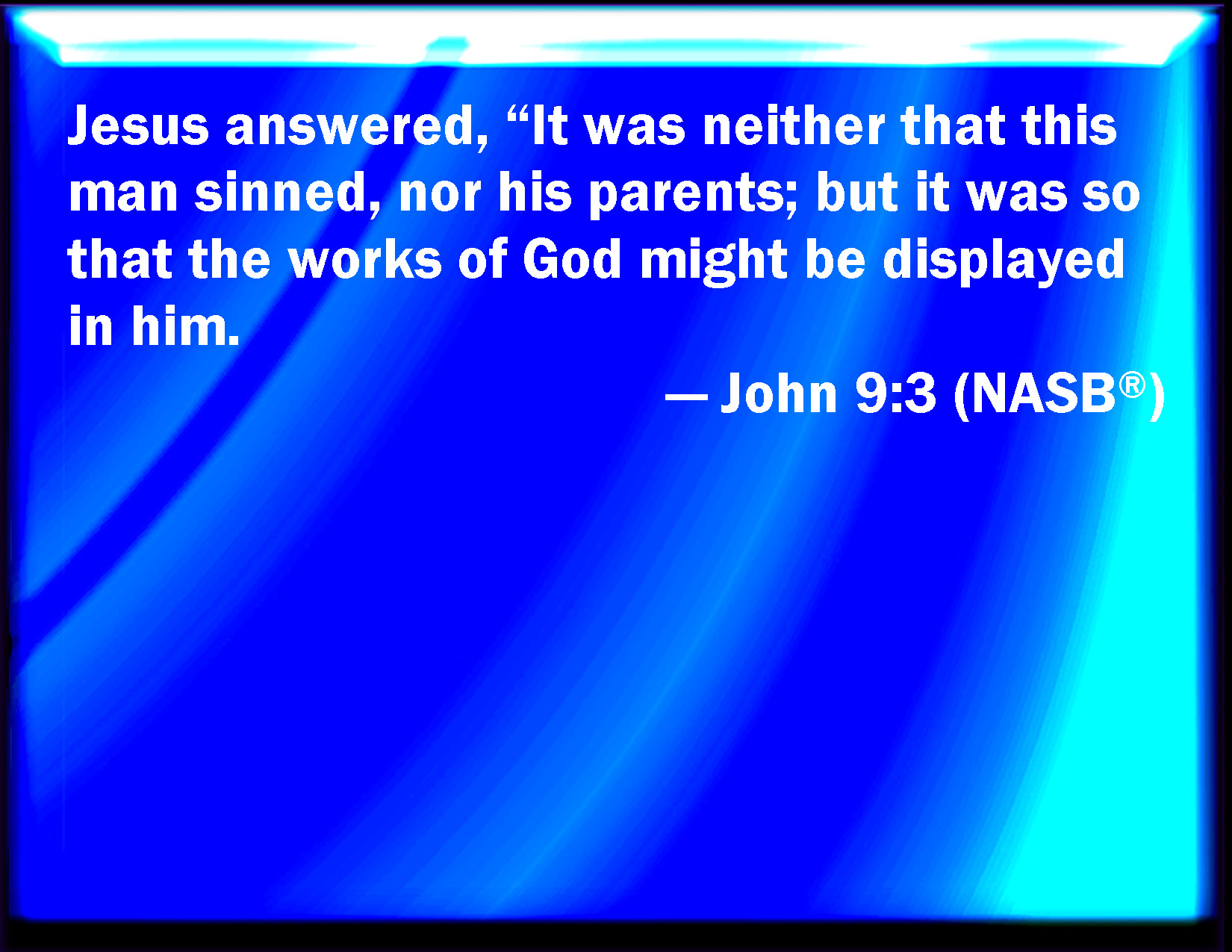 Bible Verse Slide John 9:3 Jesus answered, Neither has this man sinned, nor his parents: but that the works of God should be made manifest in him. KJV: Jesus answered, Neither hath this man sinned, nor his parents: but that the works of God should be made manifest in him. DRB: Jesus answered: Neither hath this man sinned, nor his parents; but that the works of God should be made manifest in him. DBT: Jesus answered, Neither has this man sinned nor his parents, but that the works of God should be manifested in him. ERV: Jesus answered, Neither did this man sin, nor his parents: but that the works of God should be made manifest in him. WBT: Jesus answered, Neither hath this man sinned, nor his parents: but that the works of God should be made manifest in him. WEB: Jesus answered, "Neither did this man sin, nor his parents; but, that the works of God might be revealed in him. YLT: Jesus answered, 'Neither did this one sin nor his parents, but that the works of God may be manifested in him;Links John 9:3 NIV • John 9:3 NLT • John 9:3 ESV • John 9:3 NASB • John 9:3 KJV • John 9:3 Interlinear • John 9:3 Commentaries • John 9:3 Parallel Texts • John 9:3 Bible Apps • John 9:3 Parallel • Bible Hub |