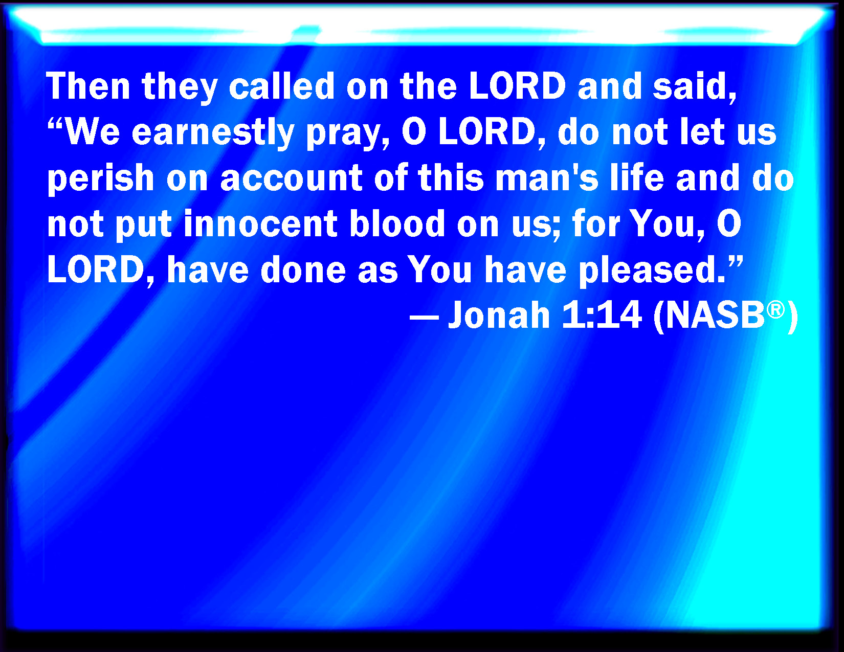 Bible Verse Slide Jonah 1:14 Why they cried to the LORD, and said, We beseech you, O LORD, we beseech you, let us not perish for this man's life, and lay not on us innocent blood: for you, O LORD, have done as it pleased you. KJV: Wherefore they cried unto the LORD, and said, We beseech thee, O LORD, we beseech thee, let us not perish for this man's life, and lay not upon us innocent blood: for thou, O LORD, hast done as it pleased thee. DRB: And they cried to the Lord, and said: We beseech thee, O Lord, let us not perish for this man's life, and lay not upon us innocent blood: for thou, O Lord, hast done as it pleased thee. DBT: And they cried unto Jehovah and said, Ah, Jehovah, we beseech thee, let us not perish for this man's life, and lay not upon us innocent blood: for thou, Jehovah, hast done as it pleased thee. ERV: Wherefore they cried unto the LORD, and said, We beseech thee, O LORD, we beseech thee, let us not perish for this man's life, and lay not upon us innocent blood: for thou, O LORD, hast done as it pleased thee. WBT: Wherefore they cried to the LORD, and said, We beseech thee, O LORD, we beseech thee, let us not perish for this man's life, and lay not upon us innocent blood: for thou, O LORD, hast done as it pleased thee. WEB: Therefore they cried to Yahweh, and said, "We beg you, Yahweh, we beg you, don't let us die for this man's life, and don't lay on us innocent blood; for you, Yahweh, have done as it pleased you." YLT: And they cry unto Jehovah, and say, 'We pray Thee, O Jehovah, let us not, we pray Thee, perish for this man's life, and do not lay on us innocent blood, for Thou, Jehovah, as Thou hast pleased, Thou hast done.'Links Jonah 1:14 NIV • Jonah 1:14 NLT • Jonah 1:14 ESV • Jonah 1:14 NASB • Jonah 1:14 KJV • Jonah 1:14 Interlinear • Jonah 1:14 Commentaries • Jonah 1:14 Parallel Texts • Jonah 1:14 Bible Apps • Jonah 1:14 Parallel • Bible Hub |