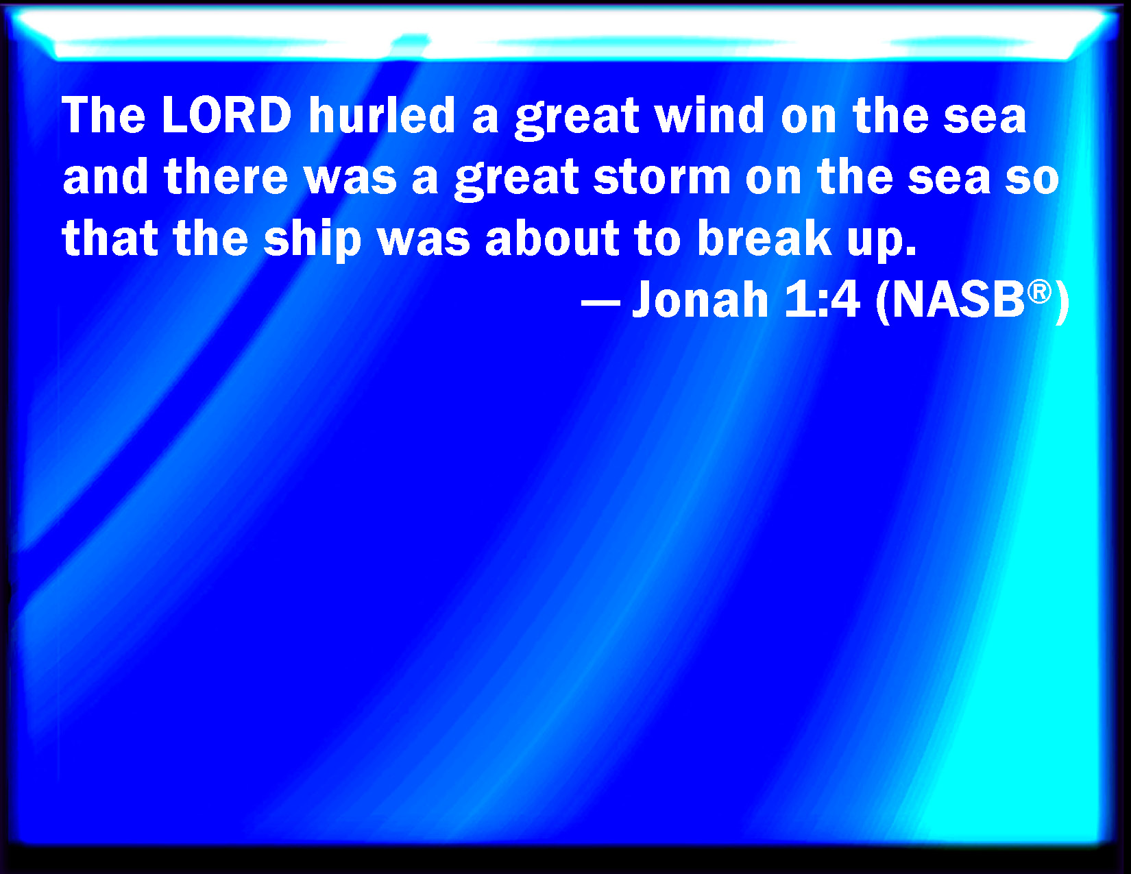 Bible Verse Slide Jonah 1:4 But the LORD sent out a great wind into the sea, and there was a mighty tempest in the sea, so that the ship was like to be broken. KJV: But the LORD sent out a great wind into the sea, and there was a mighty tempest in the sea, so that the ship was like to be broken. DRB: But the Lord sent a great wind into the sea: and a great tempest was raised in the sea, and the ship was in danger to be broken. DBT: But Jehovah sent out a great wind upon the sea, and there was a mighty tempest upon the sea, so that the ship was like to be broken. ERV: But the LORD sent out a great wind into the sea, and there was a mighty tempest in the sea, so that the ship was like to be broken. WBT: But the LORD sent out a great wind into the sea, and there was a mighty tempest in the sea, so that the ship was in danger of being broken. WEB: But Yahweh sent out a great wind on the sea, and there was a mighty storm on the sea, so that the ship was likely to break up. YLT: And Jehovah hath cast a great wind on the sea, and there is a great tempest in the sea, and the ship hath reckoned to be broken;Links Jonah 1:4 NIV • Jonah 1:4 NLT • Jonah 1:4 ESV • Jonah 1:4 NASB • Jonah 1:4 KJV • Jonah 1:4 Interlinear • Jonah 1:4 Commentaries • Jonah 1:4 Parallel Texts • Jonah 1:4 Bible Apps • Jonah 1:4 Parallel • Bible Hub |
