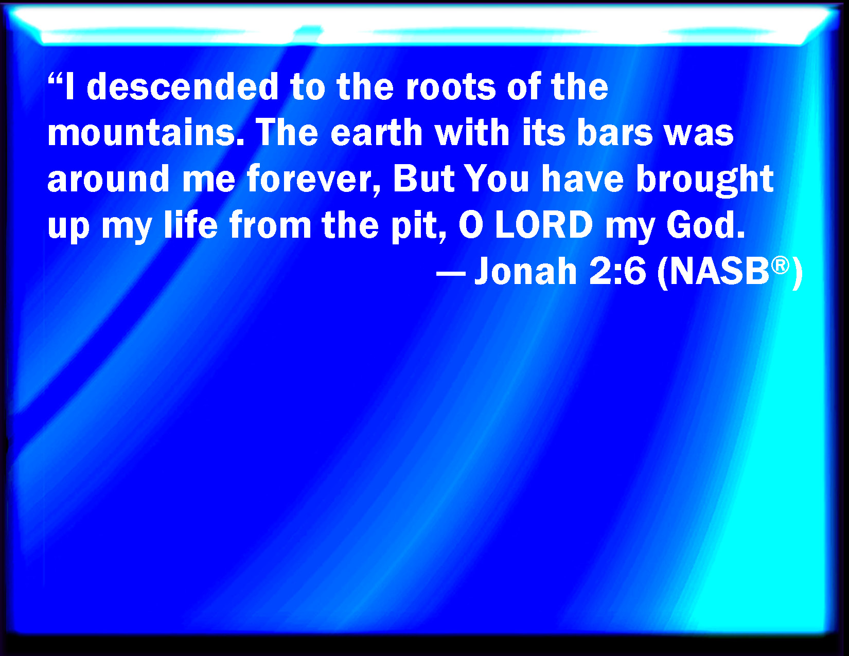 Bible Verse Slide Jonah 2:6 I went down to the bottoms of the mountains; the earth with her bars was about me for ever: yet have you brought up my life from corruption, O LORD my God. KJV: I went down to the bottoms of the mountains; the earth with her bars was about me for ever: yet hast thou brought up my life from corruption, O LORD my God. DRB: I went down to the lowest parts of the mountains: the bars of the earth have shut me up for ever: and thou wilt bring up my life from corruption, O Lord my God. DBT: I went down to the bottoms of the mountains; The bars of the earth closed upon me for ever: But thou hast brought up my life from the pit, O Jehovah my God. ERV: I went down to the bottoms of the mountains; the earth with her bars closed upon me for ever: yet hast thou brought up my life from the pit, O LORD my God. WBT: I went down to the bottoms of the mountains; the earth with her bars was about me for ever: yet hast thou brought up my life from corruption, O LORD my God. WEB: I went down to the bottoms of the mountains. The earth barred me in forever: yet have you brought up my life from the pit, Yahweh my God. YLT: To the cuttings of mountains I have come down, The earth, her bars are behind me to the age. And Thou bringest up from the pit my life, O Jehovah my God.Links Jonah 2:6 NIV • Jonah 2:6 NLT • Jonah 2:6 ESV • Jonah 2:6 NASB • Jonah 2:6 KJV • Jonah 2:6 Interlinear • Jonah 2:6 Commentaries • Jonah 2:6 Parallel Texts • Jonah 2:6 Bible Apps • Jonah 2:6 Parallel • Bible Hub |