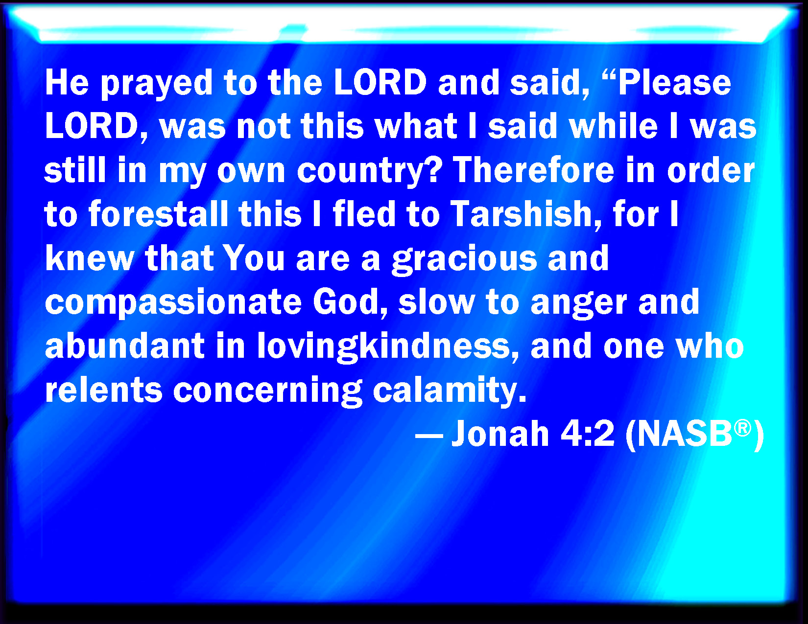 Bible Verse Slide Jonah 4:2 And he prayed to the LORD, and said, I pray you, O LORD, was not this my saying, when I was yet in my country? Therefore I fled before to Tarshish: for I knew that you are a gracious God, and merciful, slow to anger, and of great kindness, and repent you of the evil. KJV: And he prayed unto the LORD, and said, I pray thee, O LORD, was not this my saying, when I was yet in my country? Therefore I fled before unto Tarshish: for I knew that thou art a gracious God, and merciful, slow to anger, and of great kindness, and repentest thee of the evil. DRB: And he prayed to the Lord, and said: I beseech thee, O Lord, is not this what I said, when I was yet in my own country? therefore I went before to flee into Tharsis: for I know that thou art a gracious and merciful God, patient, and of much compassion, and easy to forgive evil. DBT: And he prayed unto Jehovah, and said, Ah, Jehovah, was not this my saying when I was yet in my country? Therefore I was minded to flee at first unto Tarshish; for I knew that thou art a gracious God, and merciful, slow to anger, and of great loving-kindness, and repentest thee of the evil. ERV: And he prayed unto the LORD, and said, I pray thee, O LORD, was not this my saying, when I was yet in my country? Therefore I hasted to flee unto Tarshish: for I knew that thou art a gracious God, and full of compassion, slow to anger, and plenteous in mercy, and repentest thee of the evil. WBT: And he prayed to the LORD, and said, I pray thee, O LORD was not this my saying, when I was yet in my country? Therefore I fled before to Tarshish: for I knew that thou art a gracious God, and merciful, slow to anger, and of great kindness, and repentest of the evil. WEB: He prayed to Yahweh, and said, "Please, Yahweh, wasn't this what I said when I was still in my own country? Therefore I hurried to flee to Tarshish, for I knew that you are a gracious God, and merciful, slow to anger, and abundant in loving kindness, and you relent of doing harm. YLT: and he prayeth unto Jehovah, and he saith, 'I pray Thee, O Jehovah, is not this my word while I was in mine own land — therefore I was beforehand to flee to Tarshish — that I have known that Thou art a God, gracious and merciful, slow to anger, and abundant in kindness, and repenting of evil?Links Jonah 4:2 NIV • Jonah 4:2 NLT • Jonah 4:2 ESV • Jonah 4:2 NASB • Jonah 4:2 KJV • Jonah 4:2 Interlinear • Jonah 4:2 Commentaries • Jonah 4:2 Parallel Texts • Jonah 4:2 Bible Apps • Jonah 4:2 Parallel • Bible Hub |