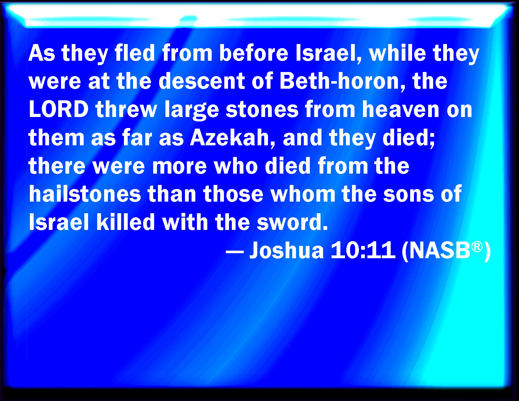 Bible Verse Slide Joshua 10:11 And it came to pass, as they fled from before Israel, and were in the going down to Bethhoron, that the LORD cast down great stones from heaven on them to Azekah, and they died: they were more which died with hailstones than they whom the children of Israel slew with the sword. KJV: And it came to pass, as they fled from before Israel, and were in the going down to Bethhoron, that the LORD cast down great stones from heaven upon them unto Azekah, and they died: they were more which died with hailstones than they whom the children of Israel slew with the sword. DRB: And when they were fleeing from the children of Israel, and were in the descent of Beth-horon, the Lord cast down upon them great stones from heaven as far as Azeca: and many more were killed with the hailstones than were slain by the swords of the children of Israel. DBT: And it came to pass, as they fled from before Israel, they were at the descent of Beth-horon, that Jehovah cast down great stones from heaven upon them up to Azekah, and they died. They were more who died with the hailstones than they whom the children of Israel had slain with the sword. ERV: And it came to pass, as they fled from before Israel, while they were in the going down of Beth-horon, that the LORD cast down great stones from heaven upon them unto Azekah, and they died: they were more which died with the hailstones than they whom the children of Israel slew with the sword. WBT: And it came to pass as they fled from before Israel, and were in the descent to Beth-horon, that the LORD cast down great stones from heaven upon them to Azekah, and they died: they were more who died with hailstones than they whom the children of Israel slew with the sword. WEB: It happened, as they fled from before Israel, while they were at the descent of Beth Horon, that Yahweh cast down great stones from the sky on them to Azekah, and they died. There were more who died from the hailstones than who the children of Israel killed with the sword. YLT: And it cometh to pass, in their fleeing from the face of Israel — they are in the descent of Beth-Horon — and Jehovah hath cast upon them great stones out of the heavens, unto Azekah, and they die; more are they who have died by the hailstones than they whom the sons of Israel have slain by the sword.Links Joshua 10:11 NIV • Joshua 10:11 NLT • Joshua 10:11 ESV • Joshua 10:11 NASB • Joshua 10:11 KJV • Joshua 10:11 Interlinear • Joshua 10:11 Commentaries • Joshua 10:11 Parallel Texts • Joshua 10:11 Bible Apps • Joshua 10:11 Parallel • Bible Hub |