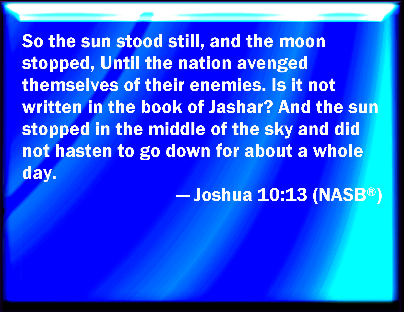 Bible Verse Slide Joshua 10:13 And the sun stood still, and the moon stayed, until the people had avenged themselves on their enemies. Is not this written in the book of Jasher? So the sun stood still in the middle of heaven, and hurried not to go down about a whole day. KJV: And the sun stood still, and the moon stayed, until the people had avenged themselves upon their enemies. Is not this written in the book of Jasher? So the sun stood still in the midst of heaven, and hasted not to go down about a whole day. DRB: And the sun and the moon stood still, till the people revenged themselves of their enemies. Is not this written in the book of the just? So the sun stood still in the midst of heaven, and hasted not to go down the space of one day. DBT: And the sun stood still, and the moon remained where it was, until the nation had avenged themselves upon their enemies. Is not this written in the book of Jasher? And the sun remained standing in the midst of heaven, and hasted not to go down about a full day. ERV: And the sun stood still, and the moon stayed, until the nation had avenged themselves of their enemies. Is not this written in the book of Jashar? And the sun stayed in the midst of heaven, and hasted not to go down about a whole day. WBT: And the sun stood still, and the moon stayed, until the people had avenged themselves upon their enemies. Is not this written in the book of Jasher? So the sun stood still in the midst of heaven, and hasted not to go down about a whole day. WEB: The sun stood still, and the moon stayed, until the nation had avenged themselves of their enemies. Isn't this written in the book of Jashar? The sun stayed in the midst of the sky, and didn't hurry to go down about a whole day. YLT: and the sun standeth still, and the moon hath stood — till the nation taketh vengeance on its enemies; is it not written on the Book of the Upright, 'and the sun standeth in the midst of the heavens, and hath not hasted to go in — as a perfect day?'Links Joshua 10:13 NIV • Joshua 10:13 NLT • Joshua 10:13 ESV • Joshua 10:13 NASB • Joshua 10:13 KJV • Joshua 10:13 Interlinear • Joshua 10:13 Commentaries • Joshua 10:13 Parallel Texts • Joshua 10:13 Bible Apps • Joshua 10:13 Parallel • Bible Hub |