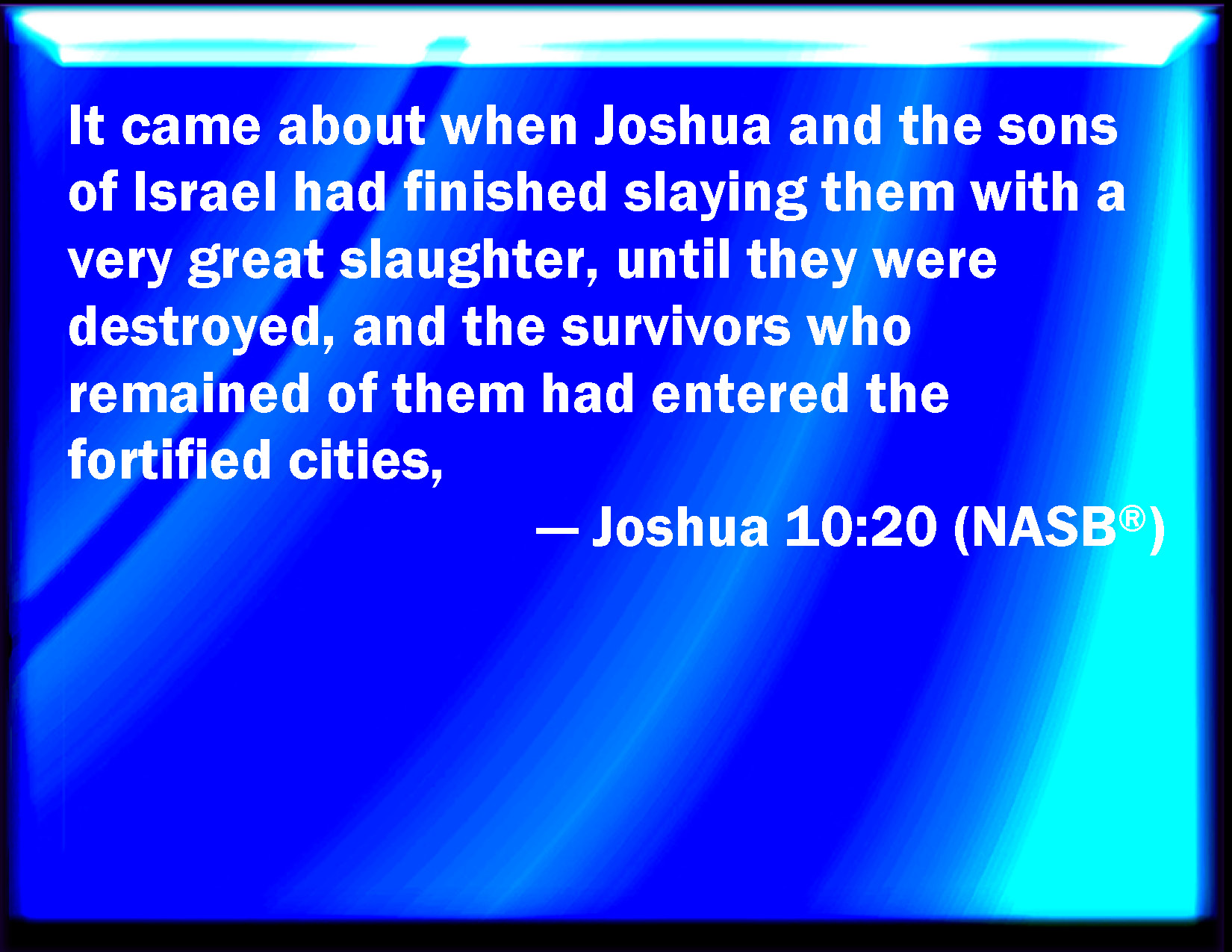 Bible Verse Slide Joshua 10:20 And it came to pass, when Joshua and the children of Israel had made an end of slaying them with a very great slaughter, till they were consumed, that the rest which remained of them entered into fenced cities. KJV: And it came to pass, when Joshua and the children of Israel had made an end of slaying them with a very great slaughter, till they were consumed, that the rest which remained of them entered into fenced cities. DRB: So the enemies being slain with a great slaughter, and almost utterly consumed, they that were able to escape from Israel, entered into fenced cities. DBT: And it came to pass when Joshua and the children of Israel had ended smiting them with a very great slaughter, until they were consumed, that the remnant which remained of them entered into fortified cities; ERV: And it came to pass, when Joshua and the children of Israel had made an end of slaying them with a very great slaughter, till they were consumed, and the remnant which remained of them had entered into the fenced cities, WBT: And it came to pass, when Joshua and the children of Israel had made an end of slaying them with a very great slaughter, till they were consumed, that the rest who remained of them entered into fortified cities. WEB: It happened, when Joshua and the children of Israel had finished killing them with a very great slaughter until they were consumed, and the remnant which remained of them had entered into the fortified cities, YLT: And it cometh to pass, when Joshua and the sons of Israel finish to smite them — a very great smiting, till they are consumed, and the remnant who have remained of them go in unto the fenced cities,Links Joshua 10:20 NIV • Joshua 10:20 NLT • Joshua 10:20 ESV • Joshua 10:20 NASB • Joshua 10:20 KJV • Joshua 10:20 Interlinear • Joshua 10:20 Commentaries • Joshua 10:20 Parallel Texts • Joshua 10:20 Bible Apps • Joshua 10:20 Parallel • Bible Hub |