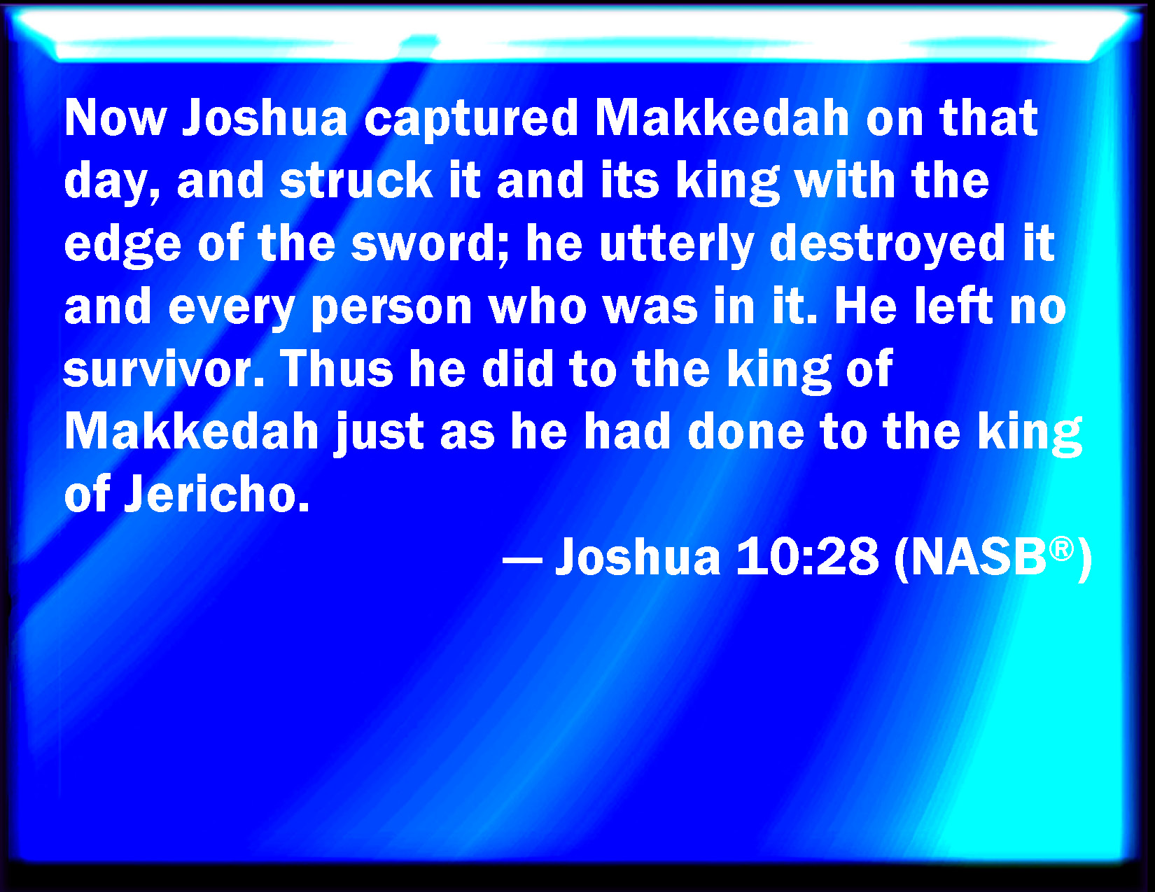 Bible Verse Slide Joshua 10:28 And that day Joshua took Makkedah, and smote it with the edge of the sword, and the king thereof he utterly destroyed, them, and all the souls that were therein; he let none remain: and he did to the king of Makkedah as he did to the king of Jericho. KJV: And that day Joshua took Makkedah, and smote it with the edge of the sword, and the king thereof he utterly destroyed, them, and all the souls that were therein; he let none remain: and he did to the king of Makkedah as he did unto the king of Jericho. DRB: The same day Josue took Maceda and destroyed it, with the edge of the sword, and killed the king and all the inhabitants thereof: he left not in it the least remains. And he did to the king of Maceda, as he had done to the king of Jericho. DBT: And Joshua took Makkedah on that day, and smote it with the edge of the sword, and the king thereof, him and all the souls that were therein he utterly destroyed; he let none remain; and he did to the king of Makkedah as he had done to the king of Jericho. ERV: And Joshua took Makkedah on that day, and smote it with the edge of the sword, and the king thereof; he utterly destroyed them and all the souls that were therein, he left none remaining: and he did to the king of Makkedah as he had done unto the king of Jericho. WBT: And that day Joshua took Makkedah, and smote it with the edge of the sword, and the king of it he utterly destroyed, them, and all the souls that were in it; he let none remain: and he did to the king of Makkedah as he did to the king of Jericho. WEB: Joshua took Makkedah on that day, and struck it with the edge of the sword, with its king. He utterly destroyed them and all the souls who were in it. He left none remaining. He did to the king of Makkedah as he had done to the king of Jericho. YLT: And Makkedah hath Joshua captured on that day, and he smiteth it by the mouth of the sword, and its king he hath devoted, them and every person who is in it — he hath not left a remnant; and he doth to the king of Makkedah as he did to the king of Jericho.Links Joshua 10:28 NIV • Joshua 10:28 NLT • Joshua 10:28 ESV • Joshua 10:28 NASB • Joshua 10:28 KJV • Joshua 10:28 Interlinear • Joshua 10:28 Commentaries • Joshua 10:28 Parallel Texts • Joshua 10:28 Bible Apps • Joshua 10:28 Parallel • Bible Hub |