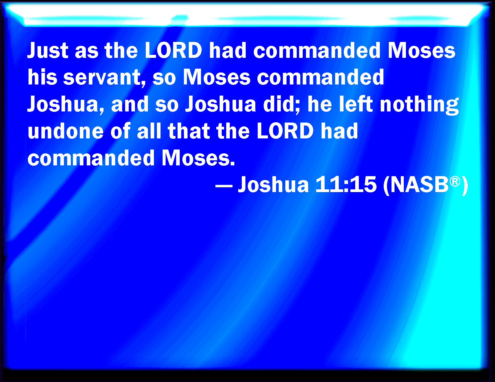 Bible Verse Slide Joshua 11:15 As the LORD commanded Moses his servant, so did Moses command Joshua, and so did Joshua; he left nothing undone of all that the LORD commanded Moses. KJV: As the LORD commanded Moses his servant, so did Moses command Joshua, and so did Joshua; he left nothing undone of all that the LORD commanded Moses. DRB: As the Lord had commanded Moses his servant, so did Moses command Josue, and he accomplished all: he left not one thing undone of all the commandments which the Lord had commanded Moses. DBT: As Jehovah had commanded Moses his servant, so did Moses command Joshua, and so did Joshua: he let nothing fail of all that Jehovah had commanded Moses. ERV: As the LORD commanded Moses his servant, so did Moses command Joshua: and so did Joshua; he left nothing undone of all that the LORD commanded Moses. WBT: As the LORD commanded Moses his servant, so did Moses command Joshua, and so did Joshua: he left nothing undone of all that the LORD commanded Moses. WEB: As Yahweh commanded Moses his servant, so Moses commanded Joshua. Joshua did so. He left nothing undone of all that Yahweh commanded Moses. YLT: As Jehovah commanded Moses His servant, so did Moses command Joshua, and so hath Joshua done; he hath not turned aside a thing of all that Jehovah commanded Moses.Links Joshua 11:15 NIV • Joshua 11:15 NLT • Joshua 11:15 ESV • Joshua 11:15 NASB • Joshua 11:15 KJV • Joshua 11:15 Interlinear • Joshua 11:15 Commentaries • Joshua 11:15 Parallel Texts • Joshua 11:15 Bible Apps • Joshua 11:15 Parallel • Bible Hub |