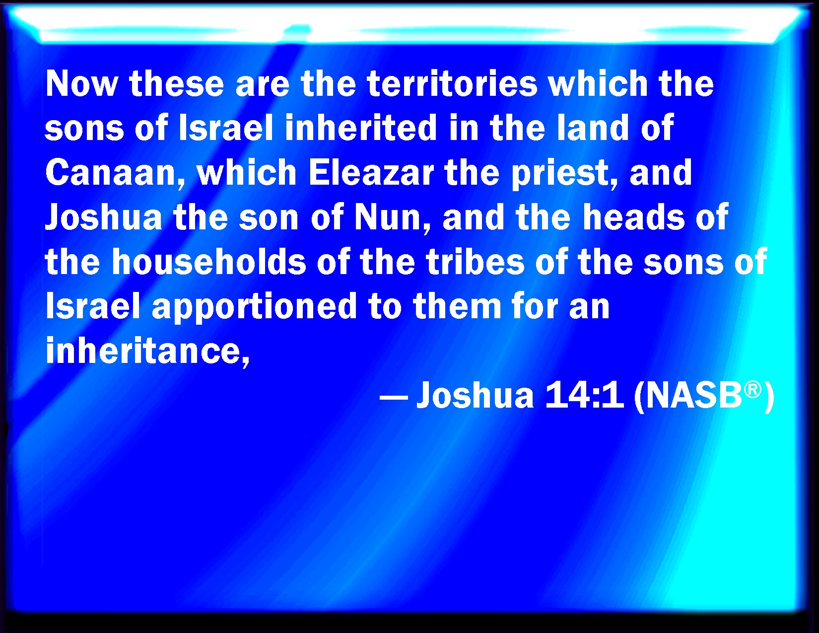 Bible Verse Slide Joshua 14:1 And these are the countries which the children of Israel inherited in the land of Canaan, which Eleazar the priest, and Joshua the son of Nun, and the heads of the fathers of the tribes of the children of Israel, distributed for inheritance to them. KJV: And these are the countries which the children of Israel inherited in the land of Canaan, which Eleazar the priest, and Joshua the son of Nun, and the heads of the fathers of the tribes of the children of Israel, distributed for inheritance to them. DRB: This is what the children of Israel possessed in the land of Chanaan, which Eleazar the priest, and Josue the son of Nun, and the princes of the families by the tribes of Israel gave to them: DBT: And this is what the children of Israel inherited in the land of Canaan, which Eleazar the priest, and Joshua the son of Nun, and the chief fathers of the tribes of the children of Israel, allotted for inheritance to them: ERV: And these are the inheritances which the children of Israel took in the land of Canaan, which Eleazar the priest, and Joshua the son of Nun, and the heads of the fathers' houses of the tribes of the children of Israel, distributed unto them, WBT: And these are the countries which the children of Israel inherited in the land of Canaan, which Eleazar the priest, and Joshua the son of Nun, and the heads of the fathers of the tribes of the children of Israel distributed for inheritance to them. WEB: These are the inheritances which the children of Israel took in the land of Canaan, which Eleazar the priest, Joshua the son of Nun, and the heads of the fathers' houses of the tribes of the children of Israel, distributed to them, YLT: And these are they of the sons of Israel who inherited in the land of Canaan, whom Eleazar the priest, and Joshua son of Nun, and the heads of the fathers of the tribes of the sons of Israel, caused to inherit;Links Joshua 14:1 NIV • Joshua 14:1 NLT • Joshua 14:1 ESV • Joshua 14:1 NASB • Joshua 14:1 KJV • Joshua 14:1 Interlinear • Joshua 14:1 Commentaries • Joshua 14:1 Parallel Texts • Joshua 14:1 Bible Apps • Joshua 14:1 Parallel • Bible Hub |