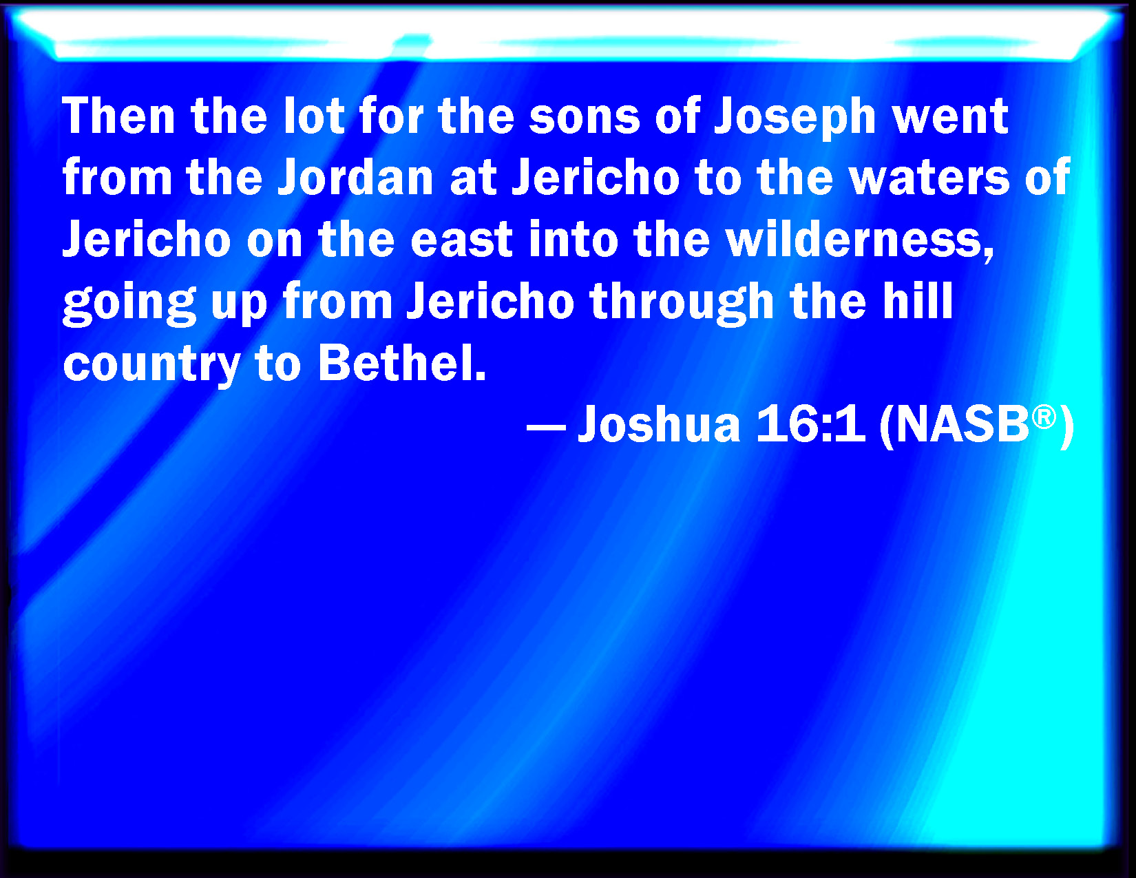 Bible Verse Slide Joshua 16:1 And the lot of the children of Joseph fell from Jordan by Jericho, to the water of Jericho on the east, to the wilderness that goes up from Jericho throughout mount Bethel, KJV: And the lot of the children of Joseph fell from Jordan by Jericho, unto the water of Jericho on the east, to the wilderness that goeth up from Jericho throughout mount Bethel, DRB: And the lot of the sons of Joseph fell from the Jordan over against Jericho and the waters thereof, on the east: the wilderness which goeth up from Jericho to the mountain of Bethel: DBT: And the lot came forth for the children of Joseph from the Jordan of Jericho as far as the waters of Jericho eastwards, to the wilderness which goes up from Jericho to the hill-country of Bethel. ERV: And the lot for the children of Joseph went out from the Jordan at Jericho, at the waters of Jericho on the east, even the wilderness, going up from Jericho through the hill country to Beth-el; WBT: And the lot of the children of Joseph fell from Jordan by Jericho, to the water of Jericho on the east, to the wilderness that goeth up from Jericho throughout mount Beth-el, WEB: The lot came out for the children of Joseph from the Jordan at Jericho, at the waters of Jericho on the east, even the wilderness, going up from Jericho through the hill country to Bethel. YLT: And the lot for the sons of Joseph goeth out from Jordan by Jericho, to the waters of Jericho on the east, to the wilderness going up from Jericho in the hill-country of Beth-El,Links Joshua 16:1 NIV • Joshua 16:1 NLT • Joshua 16:1 ESV • Joshua 16:1 NASB • Joshua 16:1 KJV • Joshua 16:1 Interlinear • Joshua 16:1 Commentaries • Joshua 16:1 Parallel Texts • Joshua 16:1 Bible Apps • Joshua 16:1 Parallel • Bible Hub |