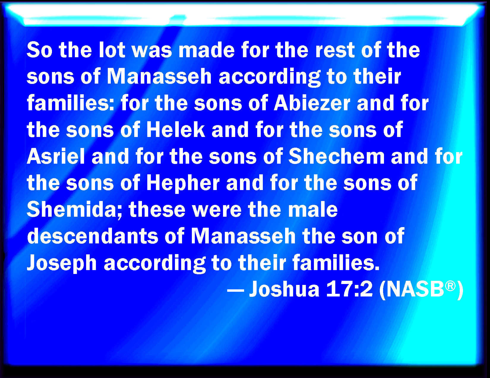 Bible Verse Slide Joshua 17:2 There was also a lot for the rest of the children of Manasseh by their families; for the children of Abiezer, and for the children of Helek, and for the children of Asriel, and for the children of Shechem, and for the children of Hepher, and for the children of Shemida: these were the male children of Manasseh the son of Joseph by their families. KJV: There was also a lot for the rest of the children of Manasseh by their families; for the children of Abiezer, and for the children of Helek, and for the children of Asriel, and for the children of Shechem, and for the children of Hepher, and for the children of Shemida: these were the male children of Manasseh the son of Joseph by their families. DRB: And to the rest of the children of Manasses according to their families: to the children of Abiezer, and to the children of Helec, and to the children of Esriel, and to the children of Sechem, and to the children of Hepher, and to the children of Semida: these are the male children of Manasses the son of Joseph, by their kindreds. DBT: There was also a portion for the rest of the children of Manasseh according to their families: for the children of Abiezer, and for the children of Helek, and for the children of Asriel, and for the children of Shechem, and for the children of Hepher, and for the children of Shemida: these are the children of Manasseh, the son of Joseph, the males, according to their families. ERV: And the lot was for the rest of the children of Manasseh according to their families; for the children of Abiezer, and for the children of Helek, and for the children of Asriel, and for the children of Shechem, and for the children of Hepher, and for the children of Shemida: these were the male children of Manasseh the son of Joseph according to their families. WBT: There was also a lot for the rest of the children of Manasseh by their families; for the children of Abiezer, and for the children of Helek, and for the children of Asriel, and for the children of Shechem, and for the children of Hepher, and for the children of Shemida: these were the male children of Manasseh the son of Joseph by their families. WEB: So this was for the rest of the children of Manasseh according to their families: for the children of Abiezer, for the children of Helek, for the children of Asriel, for the children of Shechem, for the children of Hepher, and for the children of Shemida: these were the male children of Manasseh the son of Joseph according to their families. YLT: And there is for the sons of Manasseh who are left, for their families; for the sons of Abiezer, and for the sons of Helek, and for the sons of Asriel, and for the sons of Shechem, and for the sons of Hepher, and for the sons of Shemida; these are the children of Manasseh son of Joseph — the males — by their families.Links Joshua 17:2 NIV • Joshua 17:2 NLT • Joshua 17:2 ESV • Joshua 17:2 NASB • Joshua 17:2 KJV • Joshua 17:2 Interlinear • Joshua 17:2 Commentaries • Joshua 17:2 Parallel Texts • Joshua 17:2 Bible Apps • Joshua 17:2 Parallel • Bible Hub |