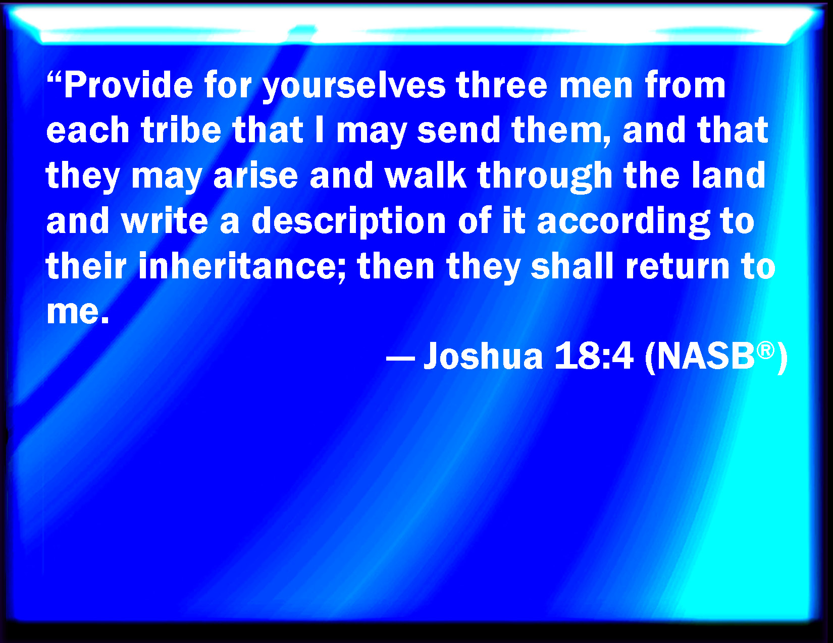 Bible Verse Slide Joshua 18:4 Give out from among you three men for each tribe: and I will send them, and they shall rise, and go through the land, and describe it according to the inheritance of them; and they shall come again to me. KJV: Give out from among you three men for each tribe: and I will send them, and they shall rise, and go through the land, and describe it according to the inheritance of them; and they shall come again to me. DRB: Choose of every tribe three men, that I may send them, and they may go and compass the land, and mark it out according to the number of each multitude: and bring back to me what they have marked out. DBT: Provide you three men for a tribe; that I may send them, and they shall rise and go through the land, and describe it according to the proportion of their inheritance, and they shall come to me. ERV: Appoint for you three men for each tribe: and I will send them, and they shall arise, and walk through the land, and describe it according to their inheritance; and they shall come unto me. WBT: Select from among you three men for each tribe: and I will send them, and they shall rise, and go through the land, and describe it according to the inheritance of them, and they shall come again to me. WEB: Appoint for yourselves three men from each tribe. I will send them, and they shall arise, walk through the land, and describe it according to their inheritance; and they shall come to me. YLT: Give for you three men for a tribe, and I send them, and they rise and go up and down through the land, and describe it according to their inheritance, and come in unto me,Links Joshua 18:4 NIV • Joshua 18:4 NLT • Joshua 18:4 ESV • Joshua 18:4 NASB • Joshua 18:4 KJV • Joshua 18:4 Interlinear • Joshua 18:4 Commentaries • Joshua 18:4 Parallel Texts • Joshua 18:4 Bible Apps • Joshua 18:4 Parallel • Bible Hub |