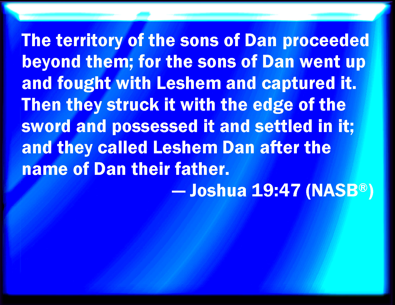 Bible Verse Slide Joshua 19:47 And the coast of the children of Dan went out too little for them: therefore the children of Dan went up to fight against Leshem, and took it, and smote it with the edge of the sword, and possessed it, and dwelled therein, and called Leshem, Dan, after the name of Dan their father. KJV: And the coast of the children of Dan went out too little for them: therefore the children of Dan went up to fight against Leshem, and took it, and smote it with the edge of the sword, and possessed it, and dwelt therein, and called Leshem, Dan, after the name of Dan their father. DRB: And is terminated there. And the children of Dan went up and fought against Lesem, and took it: and they put it to the sword, and possessed it, and dwelt in it, calling the name of it Lesem Dan, by the name of Dan their father. DBT: And the border of the children of Dan ended with these; and the children of Dan went up and fought against Leshem, and took it, and smote it with the edge of the sword, and took possession of it, and dwelt in it, and called Leshem, Dan, after the name of Dan their father. ERV: And the border of the children of Dan went out beyond them: for the children of Dan went up and fought against Leshem, and took it, and smote it with the edge of the sword, and possessed it, and dwelt therein, and called Leshem, Dan, after the name of Dan their father. WBT: And the border of the children of Dan, went out too little for them: therefore the children of Dan went up to fight against Leshem, and took it, and smote it with the edge of the sword, and possessed it, and dwelt in it, and called Leshem, Dan, after the name of Dan their father. WEB: The border of the children of Dan went out beyond them; for the children of Dan went up and fought against Leshem, and took it, and struck it with the edge of the sword, and possessed it, and lived therein, and called Leshem, Dan, after the name of Dan their father. YLT: And the border of the sons of Dan goeth out from them, and the sons of Dan go up and fight with Leshem, and capture it, and smite it by the mouth of the sword, and possess it, and dwell in it, and call Leshem, Dan, according to the name of Dan their father.Links Joshua 19:47 NIV • Joshua 19:47 NLT • Joshua 19:47 ESV • Joshua 19:47 NASB • Joshua 19:47 KJV • Joshua 19:47 Interlinear • Joshua 19:47 Commentaries • Joshua 19:47 Parallel Texts • Joshua 19:47 Bible Apps • Joshua 19:47 Parallel • Bible Hub |