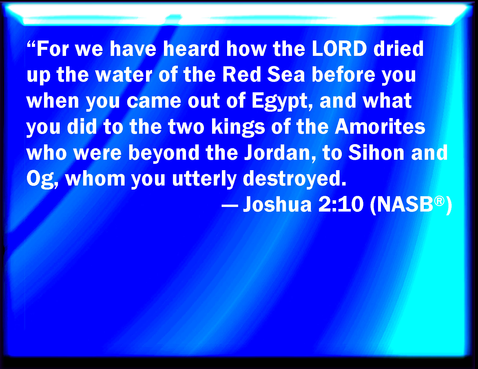 Bible Verse Slide Joshua 2:10 For we have heard how the LORD dried up the water of the Red sea for you, when you came out of Egypt; and what you did to the two kings of the Amorites, that were on the other side Jordan, Sihon and Og, whom you utterly destroyed. KJV: For we have heard how the LORD dried up the water of the Red sea for you, when ye came out of Egypt; and what ye did unto the two kings of the Amorites, that were on the other side Jordan, Sihon and Og, whom ye utterly destroyed. DRB: We have heard that the Lord dried up the water of the Red Sea at your going in, when you came out of Egypt: and what things you did to the two kings of the Amorrhites, that were beyond the Jordan: Sehon and Og whom you slew. DBT: For we have heard that Jehovah dried up the waters of the Red sea before you when ye came out of Egypt; and what ye did to the two kings of the Amorites that were beyond the Jordan, to Sihon and to Og, whom ye utterly destroyed. ERV: For we have heard how the LORD dried up the water of the Red Sea before you, when ye came out of Egypt; and what ye did unto the two kings of the Amorites, that were beyond Jordan, unto Sihon and to Og, whom ye utterly destroyed. WBT: For we have heard how the LORD dried up the water of the Red sea for you, when ye came out of Egypt; and what ye did to the two kings of the Amorites, that were on the other side of Jordan, Sihon and Og, whom ye utterly destroyed. WEB: For we have heard how Yahweh dried up the water of the Red Sea before you, when you came out of Egypt; and what you did to the two kings of the Amorites, who were beyond the Jordan, to Sihon and to Og, whom you utterly destroyed. YLT: For we have heard how Jehovah dried up the waters of the Red Sea at your presence, in your going out of Egypt, and that which ye have done to the two kings of the Amorite who are beyond the Jordan; to Sihon and to Og whom ye devoted.Links Joshua 2:10 NIV • Joshua 2:10 NLT • Joshua 2:10 ESV • Joshua 2:10 NASB • Joshua 2:10 KJV • Joshua 2:10 Interlinear • Joshua 2:10 Commentaries • Joshua 2:10 Parallel Texts • Joshua 2:10 Bible Apps • Joshua 2:10 Parallel • Bible Hub |