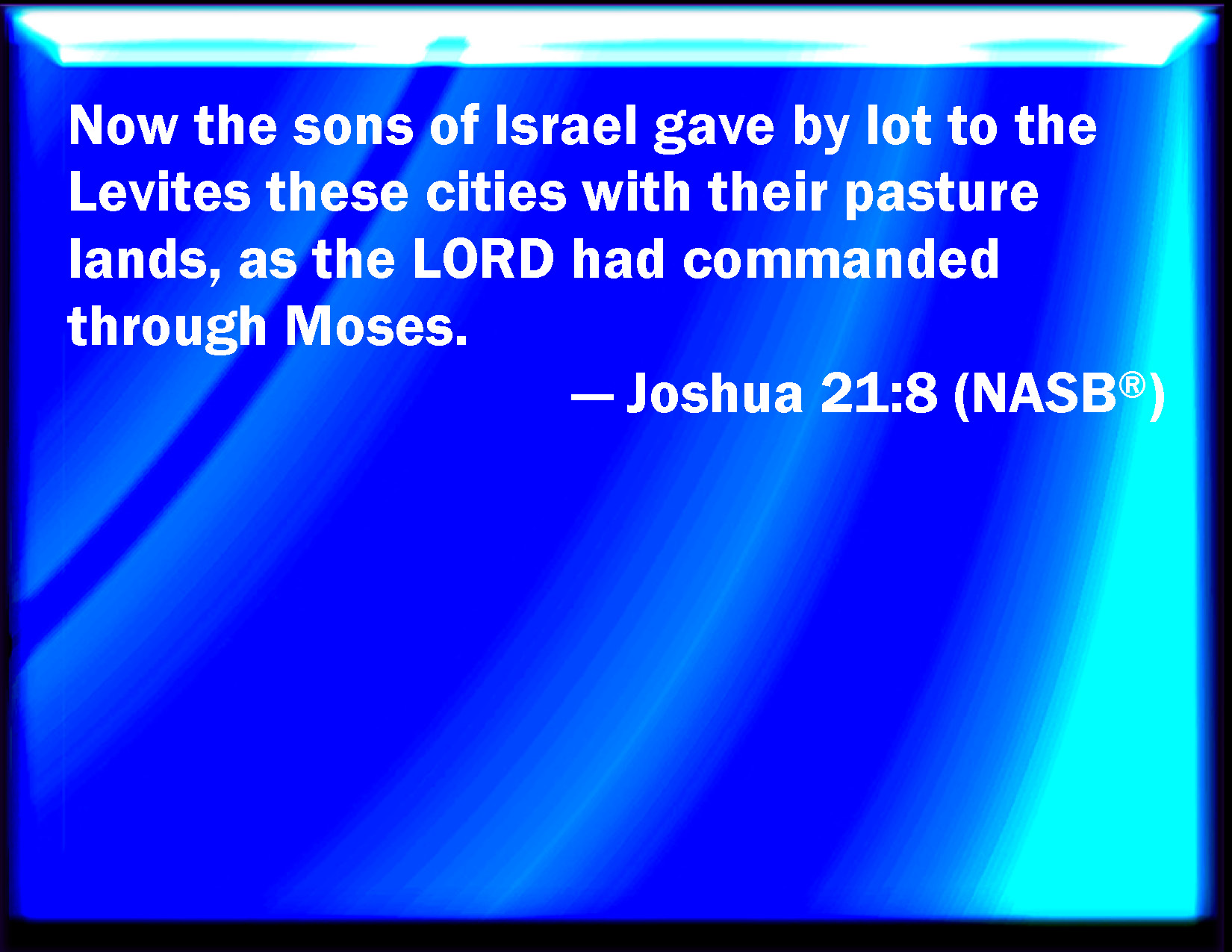 Bible Verse Slide Joshua 21:8 And the children of Israel gave by lot to the Levites these cities with their suburbs, as the LORD commanded by the hand of Moses. KJV: And the children of Israel gave by lot unto the Levites these cities with their suburbs, as the LORD commanded by the hand of Moses. DRB: And the children of Israel gave to the Levites the cities and their suburbs, as the Lord commanded by the hand of Moses, giving to every one by lot. DBT: And the children of Israel gave by lot to the Levites these cities and their suburbs, as Jehovah commanded through Moses. ERV: And the children of Israel gave by lot unto the Levites these cities with their suburbs, as the LORD commanded by the hand of Moses. WBT: And the children of Israel gave by lot to the Levites these cities with their suburbs, as the LORD commanded by the hand of Moses. WEB: The children of Israel gave these cities with their suburbs by lot to the Levites, as Yahweh commanded by Moses. YLT: And the sons of Israel give to the Levites these cities and their suburbs, as Jehovah commanded by the hand of Moses, by lot.Links Joshua 21:8 NIV • Joshua 21:8 NLT • Joshua 21:8 ESV • Joshua 21:8 NASB • Joshua 21:8 KJV • Joshua 21:8 Interlinear • Joshua 21:8 Commentaries • Joshua 21:8 Parallel Texts • Joshua 21:8 Bible Apps • Joshua 21:8 Parallel • Bible Hub |