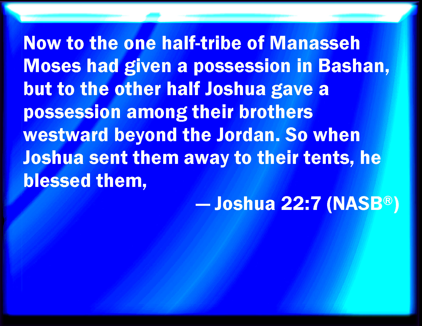 Bible Verse Slide Joshua 22:7 Now to the one half of the tribe of Manasseh Moses had given possession in Bashan: but to the other half thereof gave Joshua among their brothers on this side Jordan westward. And when Joshua sent them away also to their tents, then he blessed them, KJV: Now to the one half of the tribe of Manasseh Moses had given possession in Bashan: but unto the other half thereof gave Joshua among their brethren on this side Jordan westward. And when Joshua sent them away also unto their tents, then he blessed them, DRB: Now to half the tribe of Manasses, Moses had given a possession in Basan: and therefore to the half that remained, Josue gave a lot among the rest of their brethren beyond the Jordan to the west. And when he sent them away to their dwellings and had blessed them, DBT: And to half the tribe of Manasseh Moses had given inheritance in Bashan, and to the other half thereof had Joshua given among their brethren on this side the Jordan westward. And when Joshua sent them away to their tents, he blessed them also, ERV: Now to the one half tribe of Manasseh Moses had given inheritance in Bashan: but unto the other half gave Joshua among their brethren beyond Jordan westward. Moreover when Joshua sent them away unto their tents, he blessed them, WBT: Now to the one half of the tribe of Manasseh Moses had given possession in Bashan: but to the other half of it gave Joshua among their brethren on this side of Jordan westward. And when Joshua sent them away also to their tents, then he blessed them, WEB: Now to the one half-tribe of Manasseh Moses had given inheritance in Bashan; but to the other half gave Joshua among their brothers beyond the Jordan westward. Moreover when Joshua sent them away to their tents, he blessed them, YLT: And to the half of the tribe of Manasseh hath Moses given, in Bashan, and to its other half hath Joshua given with their brethren beyond the Jordan westward; and also when Joshua hath sent them away unto their tents, then he doth bless them,Links Joshua 22:7 NIV • Joshua 22:7 NLT • Joshua 22:7 ESV • Joshua 22:7 NASB • Joshua 22:7 KJV • Joshua 22:7 Interlinear • Joshua 22:7 Commentaries • Joshua 22:7 Parallel Texts • Joshua 22:7 Bible Apps • Joshua 22:7 Parallel • Bible Hub |