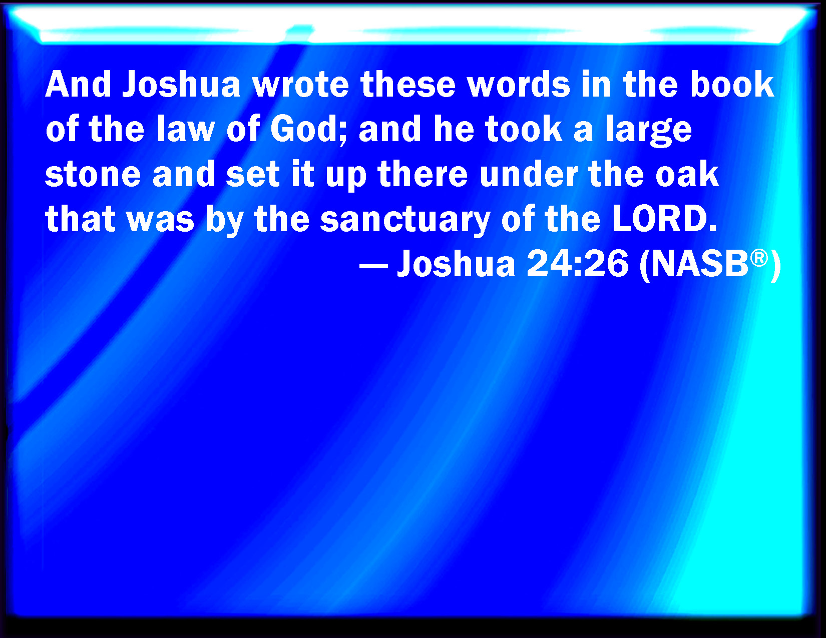 Bible Verse Slide Joshua 24:26 And Joshua wrote these words in the book of the law of God, and took a great stone, and set it up there under an oak, that was by the sanctuary of the LORD. KJV: And Joshua wrote these words in the book of the law of God, and took a great stone, and set it up there under an oak, that was by the sanctuary of the LORD. DRB: And he wrote all these things in the volume of the law of the Lord: and he took a great stone, and set it under the oak that was in the sanctuary of the Lord. DBT: And Joshua wrote these words in the book of the law of God, and took a great stone, and set it up there under the oak that was by the sanctuary of Jehovah. ERV: And Joshua wrote these words in the book of the law of God; and he took a great stone, and set it up there under the oak that was by the sanctuary of the LORD. WBT: And Joshua wrote these words in the book of the law of God, and took a great stone, and set it up there under an oak that was by the sanctuary of the LORD. WEB: Joshua wrote these words in the book of the law of God; and he took a great stone, and set it up there under the oak that was by the sanctuary of Yahweh. YLT: And Joshua writeth these words in the Book of the Law of God, and taketh a great stone, and raiseth it up there under the oak which is in the sanctuary of Jehovah.Links Joshua 24:26 NIV • Joshua 24:26 NLT • Joshua 24:26 ESV • Joshua 24:26 NASB • Joshua 24:26 KJV • Joshua 24:26 Interlinear • Joshua 24:26 Commentaries • Joshua 24:26 Parallel Texts • Joshua 24:26 Bible Apps • Joshua 24:26 Parallel • Bible Hub |