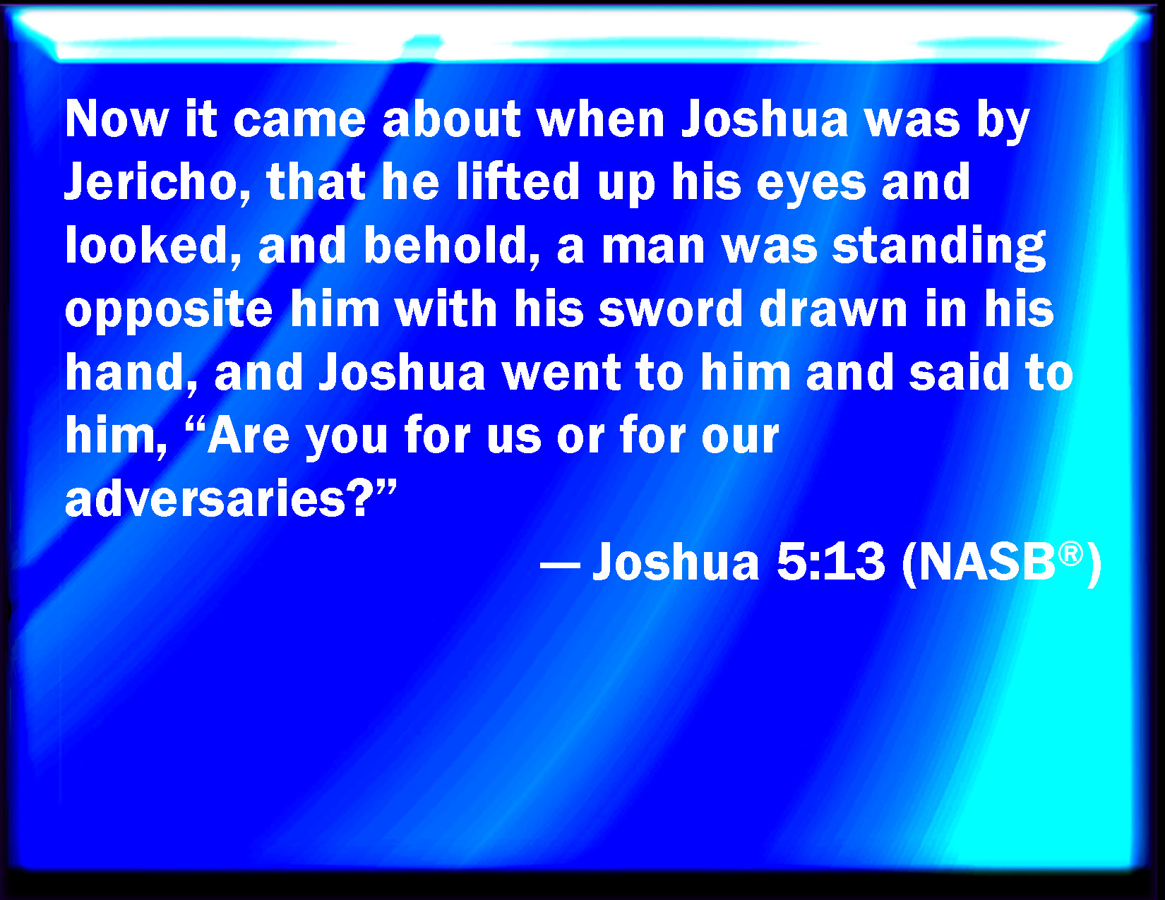 Bible Verse Slide Joshua 5:13 And it came to pass, when Joshua was by Jericho, that he lifted up his eyes and looked, and, behold, there stood a man over against him with his sword drawn in his hand: and Joshua went to him, and said to him, Are you for us, or for our adversaries? KJV: And it came to pass, when Joshua was by Jericho, that he lifted up his eyes and looked, and, behold, there stood a man over against him with his sword drawn in his hand: and Joshua went unto him, and said unto him, Art thou for us, or for our adversaries? DRB: And when Josue was in the field of the city of Jericho, he lifted up his eyes, and saw a man standing over against him: holding a drawn sword, and he went to him, and said: Art thou one of ours, or of our adversaries? DBT: And it came to pass when Joshua was by Jericho, that he lifted up his eyes and looked, and behold, there stood a man before him with his sword drawn in his hand. And Joshua went to him, and said to him: Art thou for us, or for our enemies? ERV: And it came to pass, when Joshua was by Jericho, that he lifted up his eyes and looked, and, behold, there stood a man over against him with his sword drawn in his hand: and Joshua went unto him, and said unto him, Art thou for us, or for our adversaries? WBT: And it came to pass when Joshua was by Jericho, that he lifted up his eyes and looked, and behold, there stood a man over against him with his sword drawn in his hand: and Joshua went to him, and said to him, Art thou for us, or for our adversaries? WEB: It happened, when Joshua was by Jericho, that he lifted up his eyes and looked, and behold, a man stood in front of him with his sword drawn in his hand. Joshua went to him, and said to him, "Are you for us, or for our adversaries?" YLT: And it cometh to pass in Joshua's being by Jericho, that he lifteth up his eyes, and looketh, and lo, one standing over-against him, and his drawn sword in his hand, and Joshua goeth unto him, and saith to him, 'Art thou for us or for our adversaries?'Links Joshua 5:13 NIV • Joshua 5:13 NLT • Joshua 5:13 ESV • Joshua 5:13 NASB • Joshua 5:13 KJV • Joshua 5:13 Interlinear • Joshua 5:13 Commentaries • Joshua 5:13 Parallel Texts • Joshua 5:13 Bible Apps • Joshua 5:13 Parallel • Bible Hub |