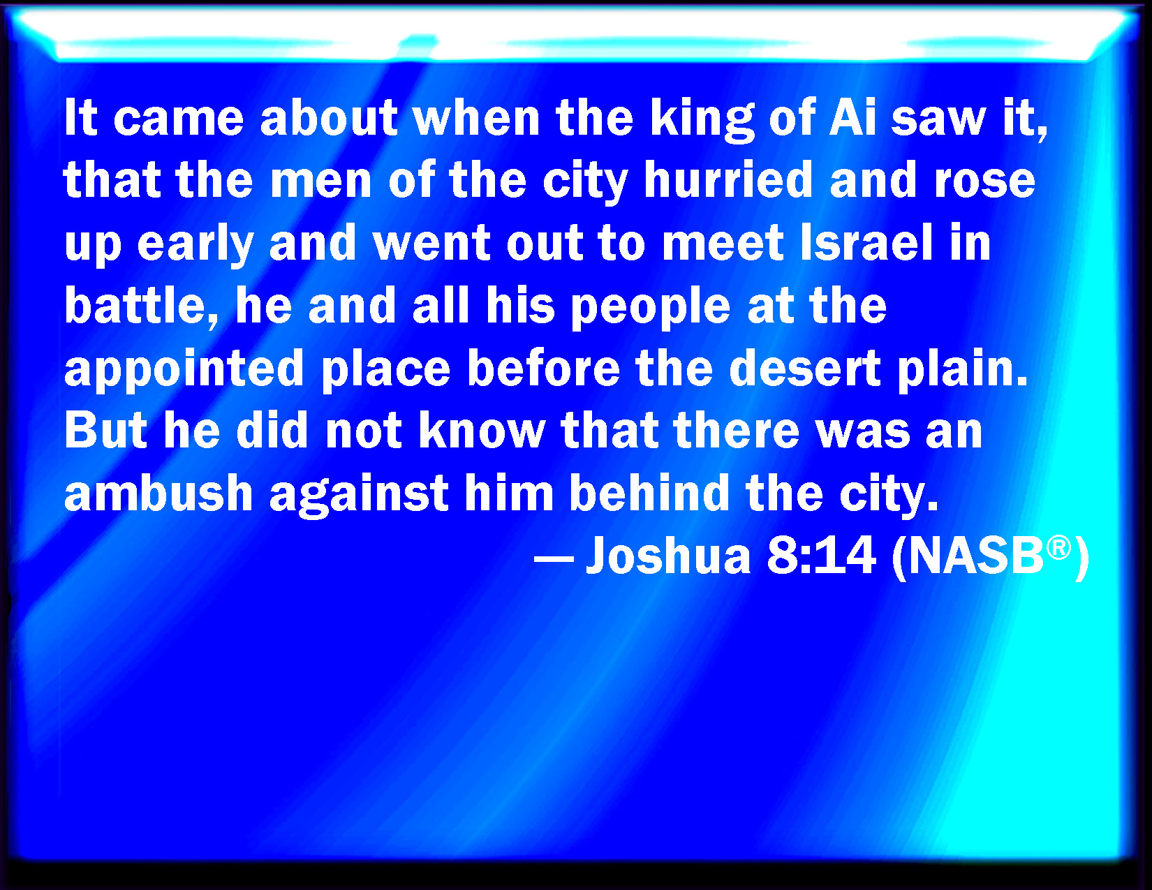 Bible Verse Slide Joshua 8:14 And it came to pass, when the king of Ai saw it, that they hurried and rose up early, and the men of the city went out against Israel to battle, he and all his people, at a time appointed, before the plain; but he knew not that there were liers in ambush against him behind the city. KJV: And it came to pass, when the king of Ai saw it, that they hasted and rose up early, and the men of the city went out against Israel to battle, he and all his people, at a time appointed, before the plain; but he wist not that there were liers in ambush against him behind the city. DRB: And when the king of Hai saw this, he made haste in the morning, and went out with all the army of the city, and set it in battle array toward the desert, not knowing that there lay an ambush behind his back. DBT: And it came to pass when the king of Ai saw it, that the men of the city hasted and rose early, and went out against Israel to battle, he and all his people, at the appointed place before the plain. But he knew not that there was an ambush against him behind the city. ERV: And it came to pass, when the king of Ai saw it, that they hasted and rose up early, and the men of the city went out against Israel to battle, he and all his people, at the time appointed, before the Arabah; but he wist not that there was an ambush against him behind the city. WBT: And it came to pass when the king of Ai saw it, that they hasted and rose early, and the men of the city went out against Israel to battle, he and all his people, at a time appointed, before the plain: but he knew not that there were liers in ambush against him behind the city. WEB: It happened, when the king of Ai saw it, that they hurried and rose up early, and the men of the city went out against Israel to battle, he and all his people, at the time appointed, before the Arabah; but he didn't know that there was an ambush against him behind the city. YLT: And it cometh to pass, when the king of Ai seeth it, that hasten, and rise early, and go out do the men of the city to meet Israel for battle, he and all his people, at the appointed season, at the front of the plain, and he hath not known that an ambush is against him, on the rear of the city.Links Joshua 8:14 NIV • Joshua 8:14 NLT • Joshua 8:14 ESV • Joshua 8:14 NASB • Joshua 8:14 KJV • Joshua 8:14 Interlinear • Joshua 8:14 Commentaries • Joshua 8:14 Parallel Texts • Joshua 8:14 Bible Apps • Joshua 8:14 Parallel • Bible Hub |