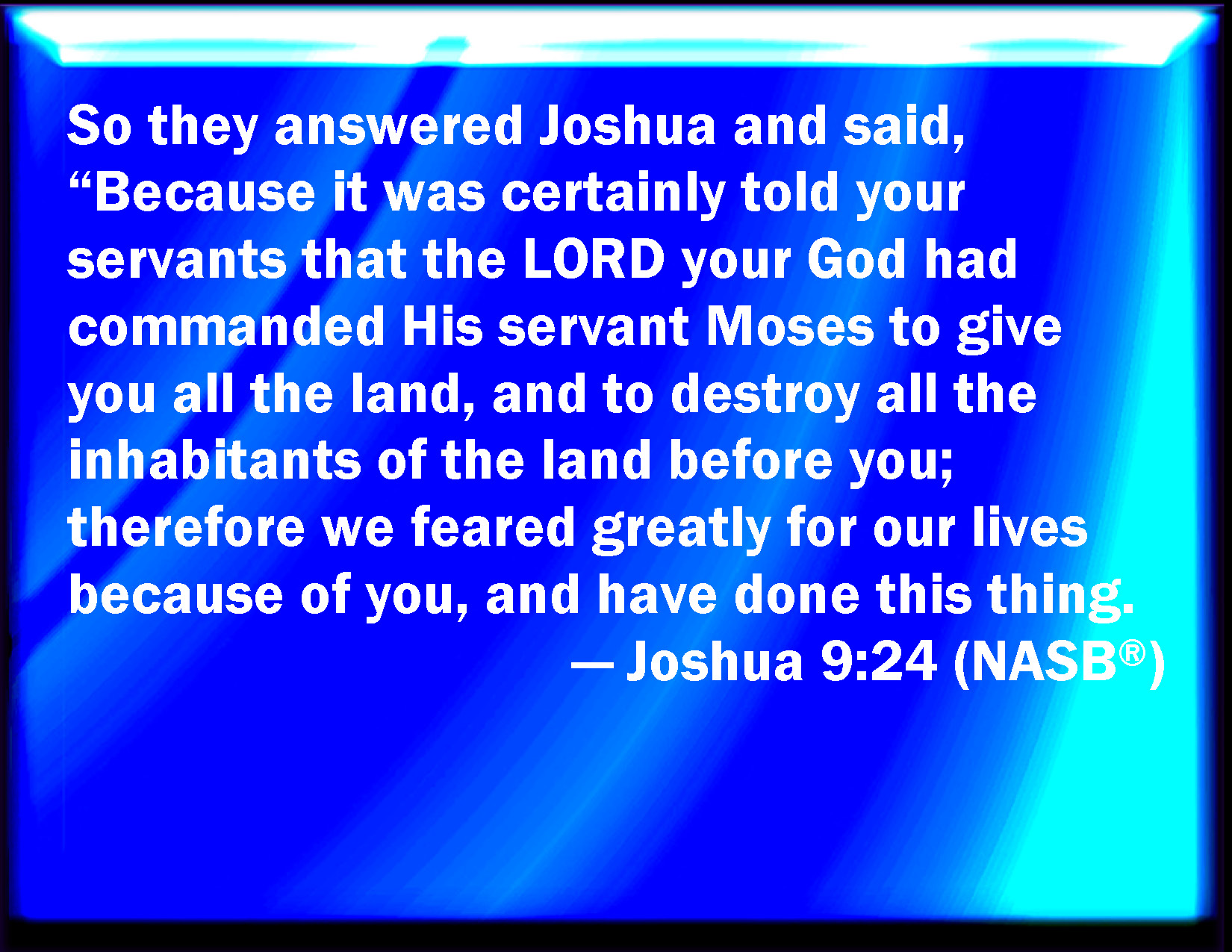 Bible Verse Slide Joshua 9:24 And they answered Joshua, and said, Because it was certainly told your servants, how that the LORD your God commanded his servant Moses to give you all the land, and to destroy all the inhabitants of the land from before you, therefore we were sore afraid of our lives because of you, and have done this thing. KJV: And they answered Joshua, and said, Because it was certainly told thy servants, how that the LORD thy God commanded his servant Moses to give you all the land, and to destroy all the inhabitants of the land from before you, therefore we were sore afraid of our lives because of you, and have done this thing. DRB: They answered: It was told us thy servants, that the Lord thy God had promised his servant Moses to give you all the land, and to destroy all the inhabitants thereof. Therefore we feared exceedingly and provided for our lives. compelled by the dread we had of you and we took this counsel. DBT: And they answered Joshua and said, Because it was certainly told thy servants how that Jehovah thy God commanded his servant Moses to give you all the land, and to destroy all the inhabitants of the land from before you; and we feared greatly for our lives because of you, and did this thing. ERV: And they answered Joshua, and said, Because it was certainly told thy servants, how that the LORD thy God commanded his servant Moses to give you all the land, and to destroy all the inhabitants of the land from before you; therefore we were sore afraid for our lives because of you, and have done this thing. WBT: And they answered Joshua, and said, Because it was certainly told thy servants, how the LORD thy God commanded his servant Moses to give you all the land, and to destroy all the inhabitants of the land from before you, therefore we were greatly afraid for our lives because of you, and have done this thing. WEB: They answered Joshua, and said, "Because your servants were certainly told how Yahweh your God commanded his servant Moses to give you all the land, and to destroy all the inhabitants of the land from before you. Therefore we were very afraid for our lives because of you, and have done this thing. YLT: And they answer Joshua and say, 'Because it was certainly declared to thy servants, that Jehovah thy God commanded Moses His servant to give to you all the land, and to destroy all the inhabitants of the land from before you; and we fear greatly for ourselves because of you, and we do this thing;Links Joshua 9:24 NIV • Joshua 9:24 NLT • Joshua 9:24 ESV • Joshua 9:24 NASB • Joshua 9:24 KJV • Joshua 9:24 Interlinear • Joshua 9:24 Commentaries • Joshua 9:24 Parallel Texts • Joshua 9:24 Bible Apps • Joshua 9:24 Parallel • Bible Hub |