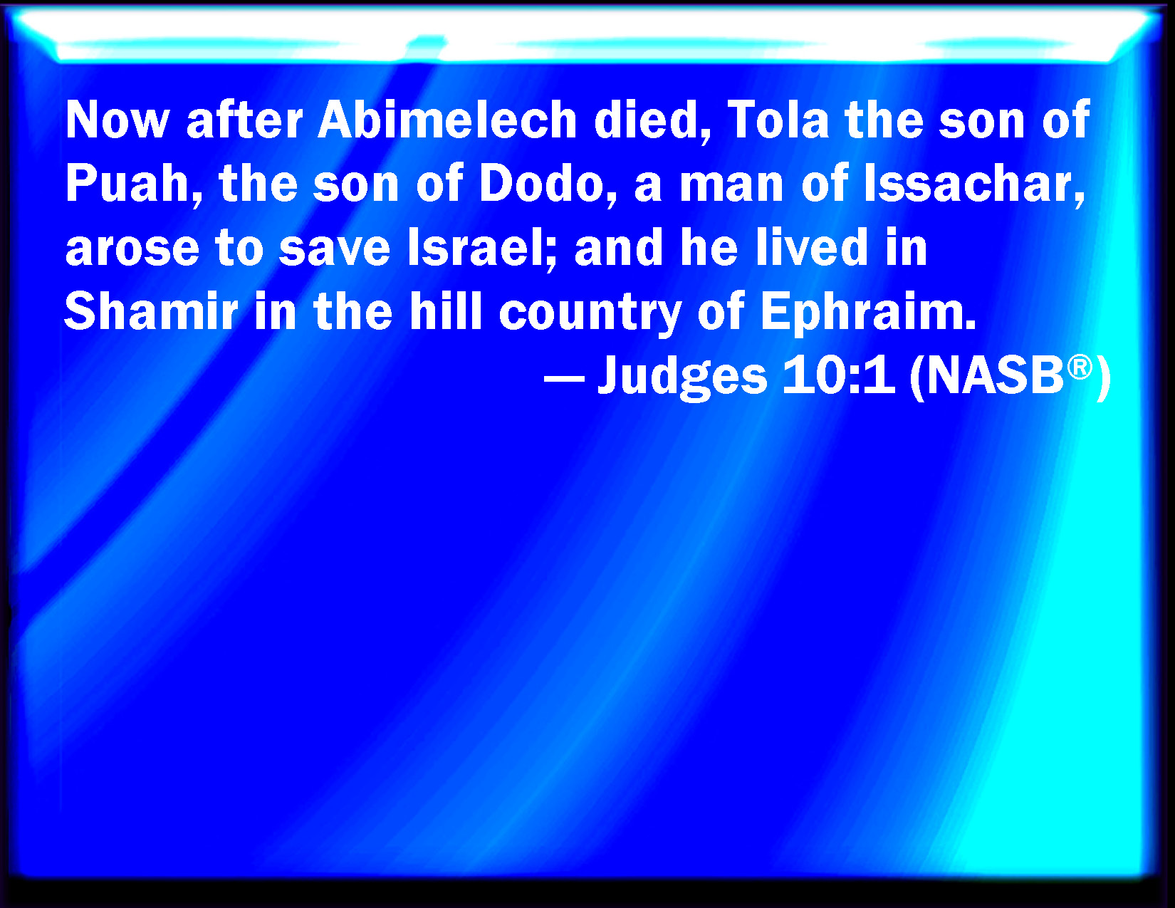 Bible Verse Slide Judges 10:1 And after Abimelech there arose to defend Israel Tola the son of Puah, the son of Dodo, a man of Issachar; and he dwelled in Shamir in mount Ephraim. KJV: And after Abimelech there arose to defend Israel Tola the son of Puah, the son of Dodo, a man of Issachar; and he dwelt in Shamir in mount Ephraim. DRB: After Abimelech there arose a ruler in Israel, Thola son of Phua the uncle of Abimelech, a man of Issachar, who dwelt in Samir of mount Ephraim: DBT: After Abim'elech there arose to deliver Israel Tola the son of Pu'ah, son of Dodo, a man of Is'sachar; and he lived at Shamir in the hill country of E'phraim. ERV: And after Abimelech there arose to save Israel Tola the son of Puah, the son of Dodo, a man of Issachar; and he dwelt in Shamir in the hill country of Ephraim. WBT: And after Abimelech there arose to defend Israel Tola the son of Puah, the son of Dodo, a man of Issachar; and he dwelt in Shamir in mount Ephraim. WEB: After Abimelech there arose to save Israel Tola the son of Puah, the son of Dodo, a man of Issachar; and he lived in Shamir in the hill country of Ephraim. YLT: And there riseth after Abimelech, to save Israel, Tola son of Puah, son of Dodo, a man of Issachar, and he is dwelling in Shamir, in the hill-country of Ephraim,Links Judges 10:1 NIV • Judges 10:1 NLT • Judges 10:1 ESV • Judges 10:1 NASB • Judges 10:1 KJV • Judges 10:1 Interlinear • Judges 10:1 Commentaries • Judges 10:1 Parallel Texts • Judges 10:1 Bible Apps • Judges 10:1 Parallel • Bible Hub |