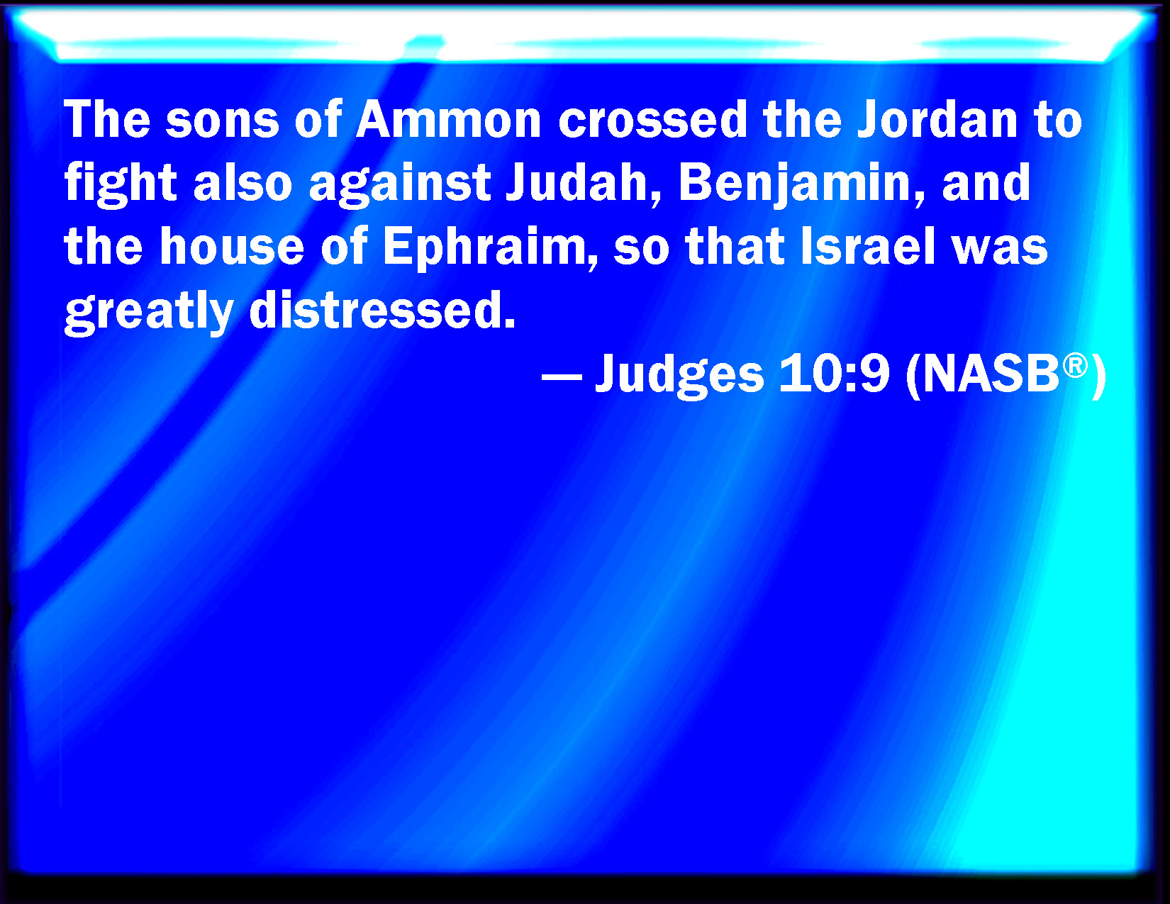 Bible Verse Slide Judges 10:9 Moreover the children of Ammon passed over Jordan to fight also against Judah, and against Benjamin, and against the house of Ephraim; so that Israel was sore distressed. KJV: Moreover the children of Ammon passed over Jordan to fight also against Judah, and against Benjamin, and against the house of Ephraim; so that Israel was sore distressed. DRB: Insomuch that the children of Ammon passing over the Jordan, wasted Juda and Benjamin and Ephraim: and Israel was distressed exceedingly. DBT: And the Ammonites crossed the Jordan to fight also against Judah and against Benjamin and against the house of E'phraim; so that Israel was sorely distressed. ERV: And the children of Ammon passed over Jordan to fight also against Judah, and against Benjamin, and against the house of Ephraim; so that Israel was sore distressed. WBT: Moreover, the children of Ammon passed over Jordan, to fight also against Judah, and against Benjamin, and against the house of Ephraim; so that Israel was greatly distressed. WEB: The children of Ammon passed over the Jordan to fight also against Judah, and against Benjamin, and against the house of Ephraim; so that Israel was very distressed. YLT: And the Bene-Ammon pass over the Jordan to fight also against Judah, and against Benjamin, and against the house of Ephraim, and Israel hath great distress.Links Judges 10:9 NIV • Judges 10:9 NLT • Judges 10:9 ESV • Judges 10:9 NASB • Judges 10:9 KJV • Judges 10:9 Interlinear • Judges 10:9 Commentaries • Judges 10:9 Parallel Texts • Judges 10:9 Bible Apps • Judges 10:9 Parallel • Bible Hub |