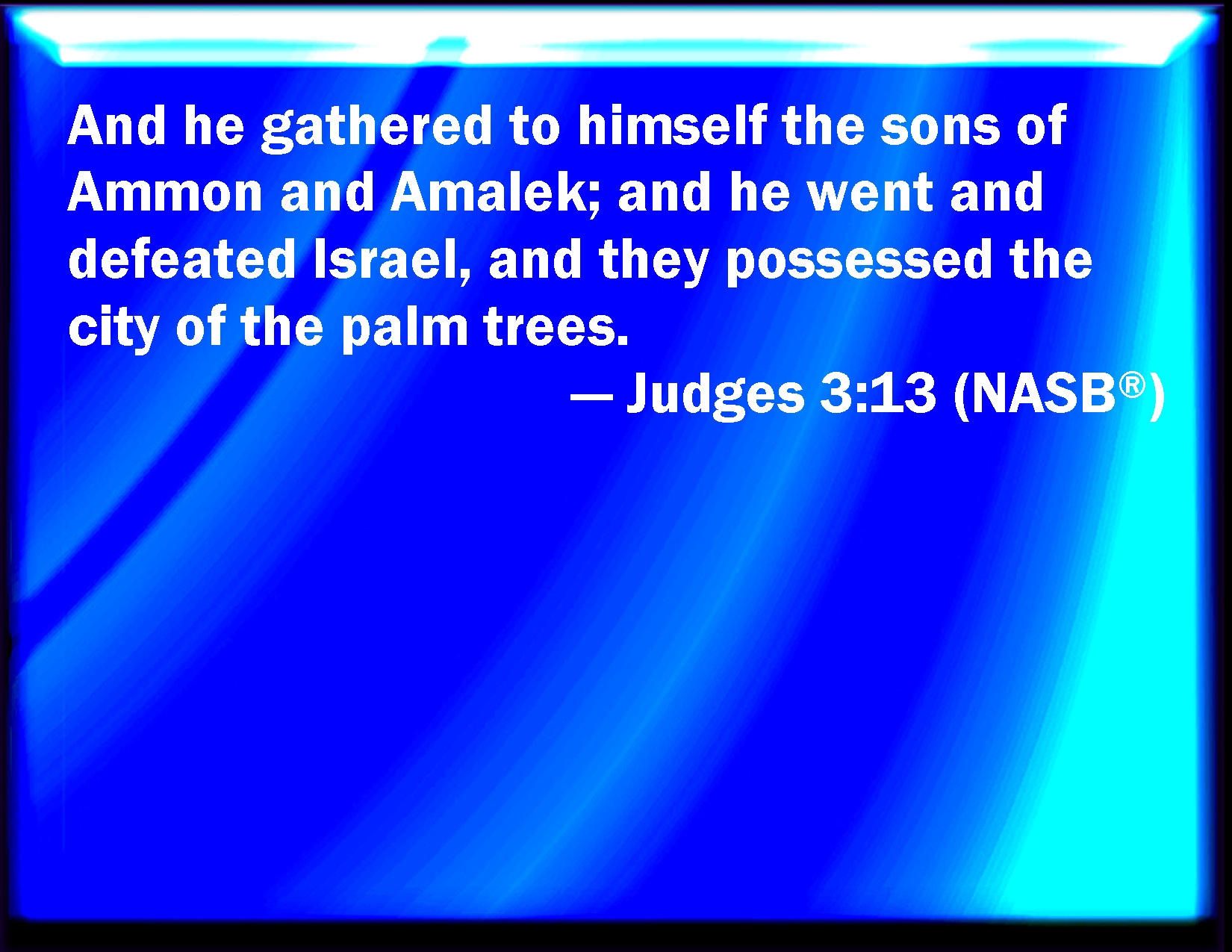Bible Verse Slide Judges 3:13 And he gathered to him the children of Ammon and Amalek, and went and smote Israel, and possessed the city of palm trees. KJV: And he gathered unto him the children of Ammon and Amalek, and went and smote Israel, and possessed the city of palm trees. DRB: And he joined to him the children of Ammon, and Amalec: and he went and overthrew Israel, and possessed the city of palm trees. DBT: He gathered to himself the Ammonites and the Amal'ekites, and went and defeated Israel; and they took possession of the city of palms. ERV: And he gathered unto him the children of Ammon and Amalek; and went and smote Israel, and they possessed the city of palm trees. WBT: And he gathered to him the children of Ammon and Amalek, and went and smote Israel, and possessed the city of palm-trees. WEB: He gathered to him the children of Ammon and Amalek; and he went and struck Israel, and they possessed the city of palm trees. YLT: and he gathereth unto him the Bene-Ammon and Amalek, and goeth and smiteth Israel, and they possess the city of palms;Links Judges 3:13 NIV • Judges 3:13 NLT • Judges 3:13 ESV • Judges 3:13 NASB • Judges 3:13 KJV • Judges 3:13 Interlinear • Judges 3:13 Commentaries • Judges 3:13 Parallel Texts • Judges 3:13 Bible Apps • Judges 3:13 Parallel • Bible Hub |