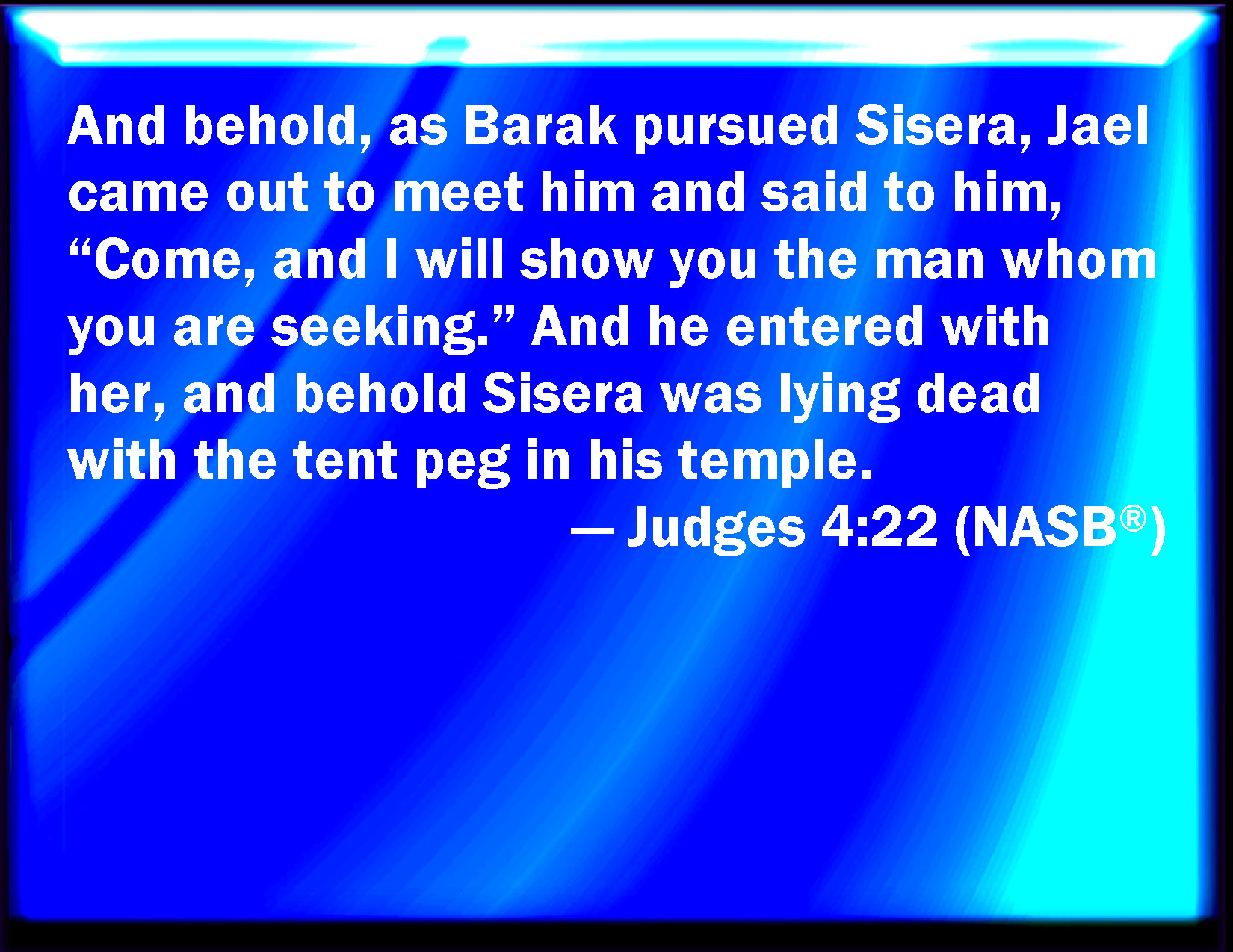 Bible Verse Slide Judges 4:22 And, behold, as Barak pursued Sisera, Jael came out to meet him, and said to him, Come, and I will show you the man whom you seek. And when he came into her tent, behold, Sisera lay dead, and the nail was in his temples. KJV: And, behold, as Barak pursued Sisera, Jael came out to meet him, and said unto him, Come, and I will shew thee the man whom thou seekest. And when he came into her tent, behold, Sisera lay dead, and the nail was in his temples. DRB: And behold Barac came pursuing after Sisara: and Jahel went out to meet him, and said to him: Come, and I will shew thee, the man whom thou seekest. And when he came into her tent, be saw Sisara lying dead, and the nail fastened in his temples. DBT: And behold, as Barak pursued Sis'era, Ja'el went out to meet him, and said to him, "Come, and I will show you the man whom you are seeking." So he went in to her tent; and there lay Sis'era dead, with the tent peg in his temple. ERV: And, behold, as Barak pursued Sisera, Jael came out to meet him, and said unto him, Come, and I will shew thee the man whom thou seekest. And he came unto her; and, behold, Sisera lay dead, and the tent-pin was in his temples. WBT: And behold, as Barak pursued Sisera, Jael came out to meet him, and said to him, Come, and I will show thee the man whom thou seekest. And when he came into her tent, behold, Sisera lay dead, and the nail was in his temples. WEB: Behold, as Barak pursued Sisera, Jael came out to meet him, and said to him, "Come, and I will show you the man whom you seek." He came to her; and behold, Sisera lay dead, and the tent peg was in his temples. YLT: And lo, Barak is pursuing Sisera, and Jael cometh out to meet him, and saith to him, 'Come, and I shew thee the man whom thou art seeking;' and he cometh in unto her, and lo, Sisera is fallen — dead, and the pin in his temples.Links Judges 4:22 NIV • Judges 4:22 NLT • Judges 4:22 ESV • Judges 4:22 NASB • Judges 4:22 KJV • Judges 4:22 Interlinear • Judges 4:22 Commentaries • Judges 4:22 Parallel Texts • Judges 4:22 Bible Apps • Judges 4:22 Parallel • Bible Hub |