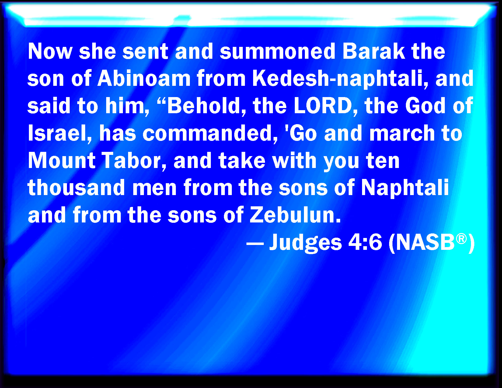 Bible Verse Slide Judges 4:6 And she sent and called Barak the son of Abinoam out of Kedeshnaphtali, and said to him, Has not the LORD God of Israel commanded, saying, Go and draw toward mount Tabor, and take with you ten thousand men of the children of Naphtali and of the children of Zebulun? KJV: And she sent and called Barak the son of Abinoam out of Kedeshnaphtali, and said unto him, Hath not the LORD God of Israel commanded, saying, Go and draw toward mount Tabor, and take with thee ten thousand men of the children of Naphtali and of the children of Zebulun? DRB: And she sent and called Barac the son of Abinoem out of Cedes in Nephtali: and she said to him: The Lord God of Israel hath commanded thee: Go, and lead an army to mount Thabor, and thou shalt take with thee ten thousand fighting men of the children of Nephtali, and of the children of Zabulon: DBT: She sent and summoned Barak the son of Abin'o-am from Kedesh in Naph'tali, and said to him, "The LORD, the God of Israel, commands you, 'Go, gather your men at Mount Tabor, taking ten thousand from the tribe of Naph'tali and the tribe of Zeb'ulun. ERV: Ands she sent and called Barak the son of Abinoam out of Kedesh-naphtali, and said unto him, Hath not the LORD, the God of Israel, commanded, saying, Go and draw unto mount Tabor, and take with thee ten thousand men of the children of Naphtali and of the children of Zebulun? WBT: And she sent and called Barak the son of Abinoam from Kedesh-naphtali, and said to him, Hath not the LORD God of Israel commanded, saying, Go, and draw towards mount Tabor, and take with thee ten thousand men of the children of Naphtali, and of the children of Zebulun? WEB: She sent and called Barak the son of Abinoam out of Kedesh Naphtali, and said to him, "Hasn't Yahweh, the God of Israel, commanded, 'Go and draw to Mount Tabor, and take with you ten thousand men of the children of Naphtali and of the children of Zebulun? YLT: And she sendeth and calleth for Barak son of Abinoam, out of Kedesh-Naphtali, and saith unto him, 'Hath not Jehovah, God of Israel, commanded? go, and thou hast drawn towards mount Tabor, and hast taken with thee ten thousand men, out of the sons of Naphtali, and out of the sons of Zebulun,Links Judges 4:6 NIV • Judges 4:6 NLT • Judges 4:6 ESV • Judges 4:6 NASB • Judges 4:6 KJV • Judges 4:6 Interlinear • Judges 4:6 Commentaries • Judges 4:6 Parallel Texts • Judges 4:6 Bible Apps • Judges 4:6 Parallel • Bible Hub |
