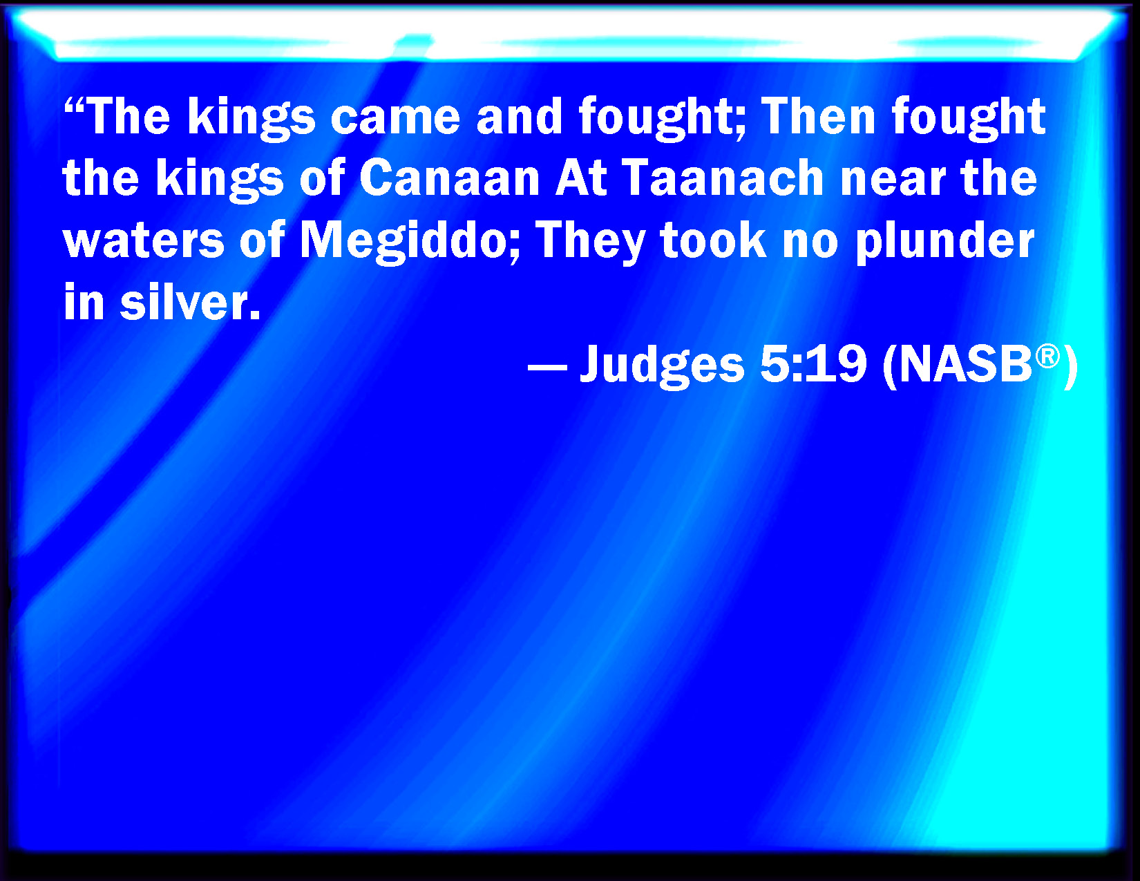 Bible Verse Slide Judges 5:19 The kings came and fought, then fought the kings of Canaan in Taanach by the waters of Megiddo; they took no gain of money. KJV: The kings came and fought, then fought the kings of Canaan in Taanach by the waters of Megiddo; they took no gain of money. DRB: The kings came and fought, the kings of Chanaan fought in Thanach by the waters of Mageddo, and yet they took no spoils. DBT: "The kings came, they fought; then fought the kings of Canaan, at Ta'anach, by the waters of Megid'do; they got no spoils of silver. ERV: The kings came and fought; then fought the kings of Canaan; in Taanach by the waters of Meggido: they took no gain of money. WBT: The kings came and fought, then fought the kings of Canaan in Tanach by the waters of Megiddo; they took no gain of money. WEB: "The kings came and fought, then the kings of Canaan fought at Taanach by the waters of Megiddo. They took no plunder of silver. YLT: Kings came — they fought; Then fought kings of Canaan, In Taanach, by the waters of Megiddo; Gain of money they took not!Links Judges 5:19 NIV • Judges 5:19 NLT • Judges 5:19 ESV • Judges 5:19 NASB • Judges 5:19 KJV • Judges 5:19 Interlinear • Judges 5:19 Commentaries • Judges 5:19 Parallel Texts • Judges 5:19 Bible Apps • Judges 5:19 Parallel • Bible Hub |