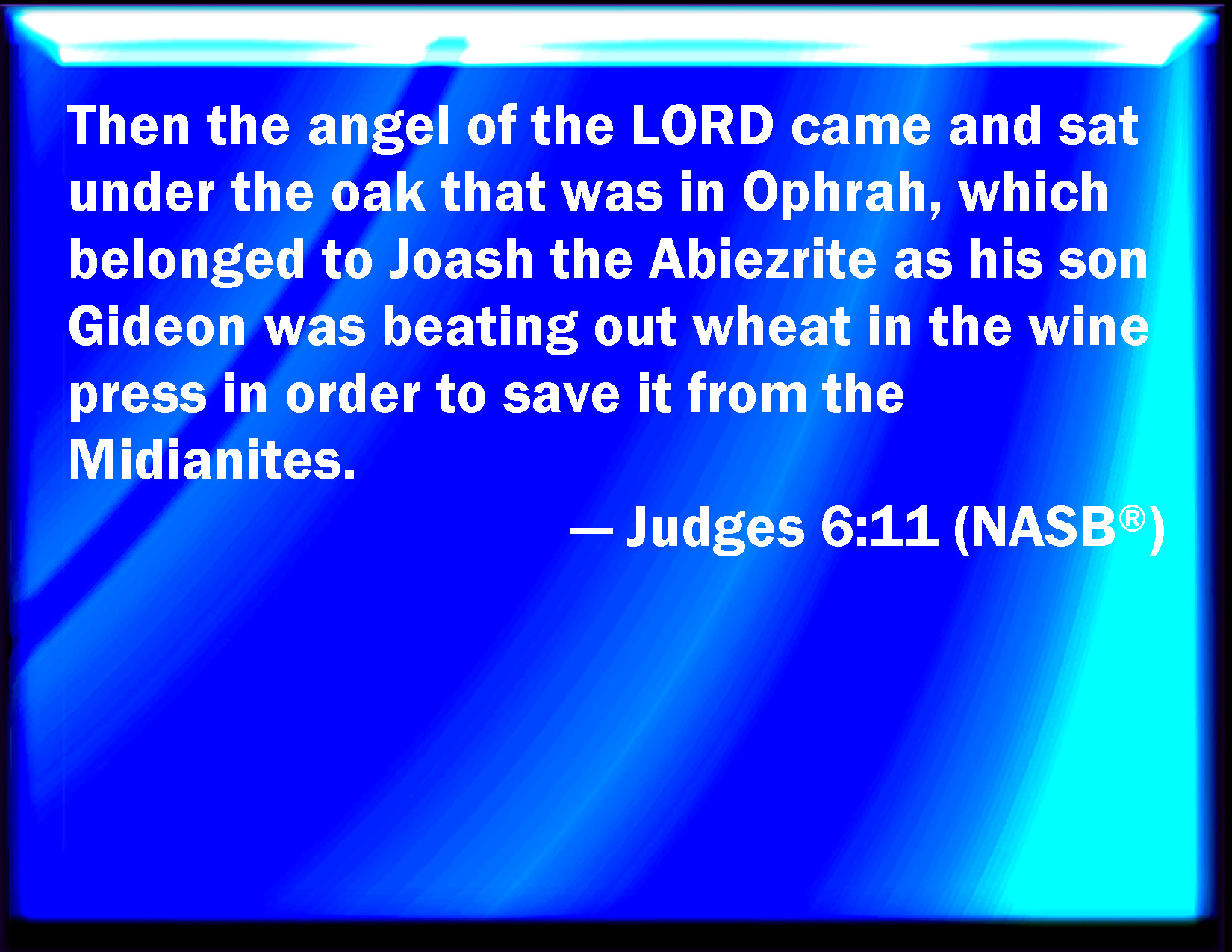 Bible Verse Slide Judges 6:11 And there came an angel of the LORD, and sat under an oak which was in Ophrah, that pertained to Joash the Abiezrite: and his son Gideon threshed wheat by the wine press, to hide it from the Midianites. KJV: And there came an angel of the LORD, and sat under an oak which was in Ophrah, that pertained unto Joash the Abiezrite: and his son Gideon threshed wheat by the winepress, to hide it from the Midianites. DRB: And an angel of the Lord came, and sat under an oak, that was in Ephra, and belonged to Joas the father of the family of Ezri. And when Gedeon his son was threshing and cleansing wheat by the winepress, to flee from Madian, DBT: Now the angel of the LORD came and sat under the oak at Ophrah, which belonged to Jo'ash the Abiez'rite, as his son Gideon was beating out wheat in the wine press, to hide it from the Mid'ianites. ERV: And the angel of the LORD came and sat under the oak which was in Ophrah, that pertained unto Joash the Abiezrite: and his son Gideon was beating out wheat in the winepress, to hide it from the Midianites. WBT: And there came an angel of the LORD, and sat under an oak which was in Ophrah, that pertained to Joash the Abi-ezrite: and his son Gideon thrashed wheat by the wine-press, to hide it from the Midianites. WEB: The angel of Yahweh came, and sat under the oak which was in Ophrah, that pertained to Joash the Abiezrite: and his son Gideon was beating out wheat in the winepress, to hide it from the Midianites. YLT: And the messenger of Jehovah cometh and sitteth under the oak which is in Ophrah, which is to Joash the Abi-Ezrite, and Gideon his son is beating out wheat in the wine-press, to remove it from the presence of the Midianites;Links Judges 6:11 NIV • Judges 6:11 NLT • Judges 6:11 ESV • Judges 6:11 NASB • Judges 6:11 KJV • Judges 6:11 Interlinear • Judges 6:11 Commentaries • Judges 6:11 Parallel Texts • Judges 6:11 Bible Apps • Judges 6:11 Parallel • Bible Hub |
